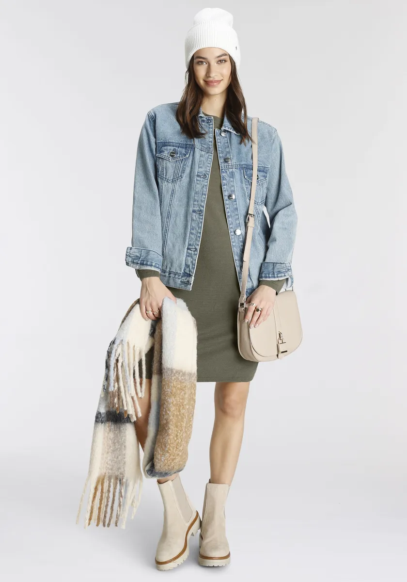 Если вы хотите, чтобы наряд выглядел комфортно, но в то же время женственно, трикотажное платье от Тамарис – хорошая основа. Имеет более широкий крой и достигает середины бедра. Благодаря эластичному материалу платье легкое и комфортное.