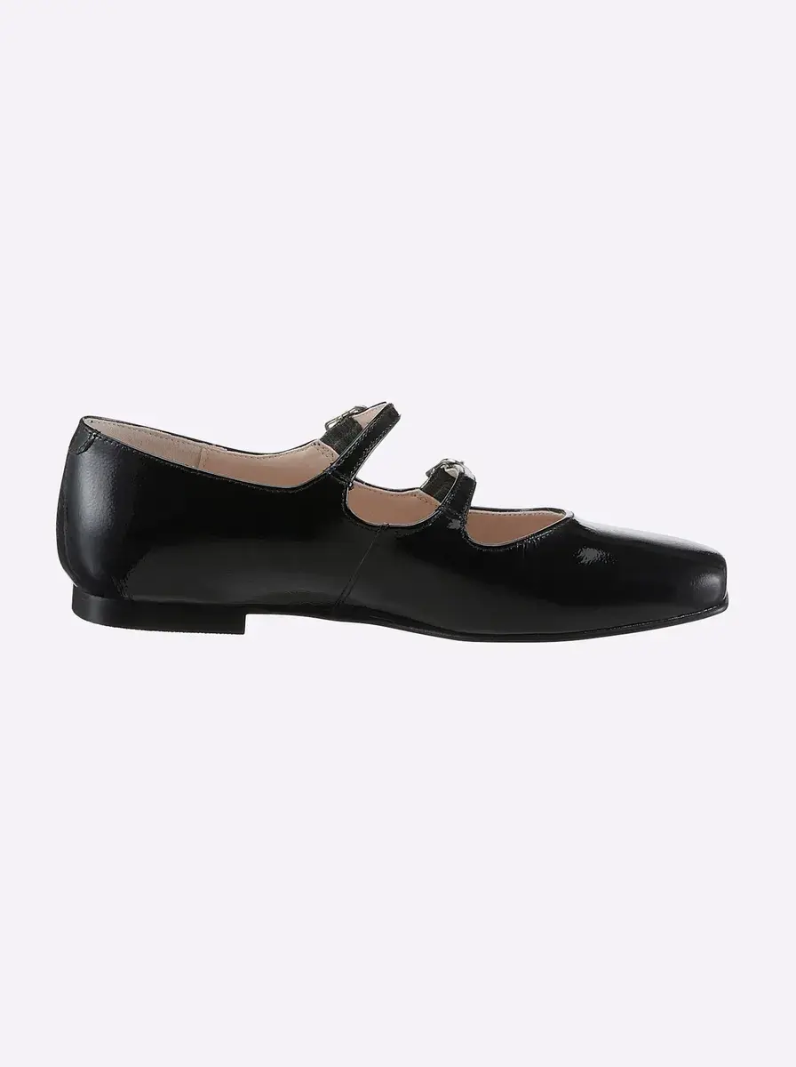 Балетки из блестящей яловой лаковой кожи. С женственными бретелями. Подкладка текстильная, стелька кожаная. Высота каблука около 10 мм.