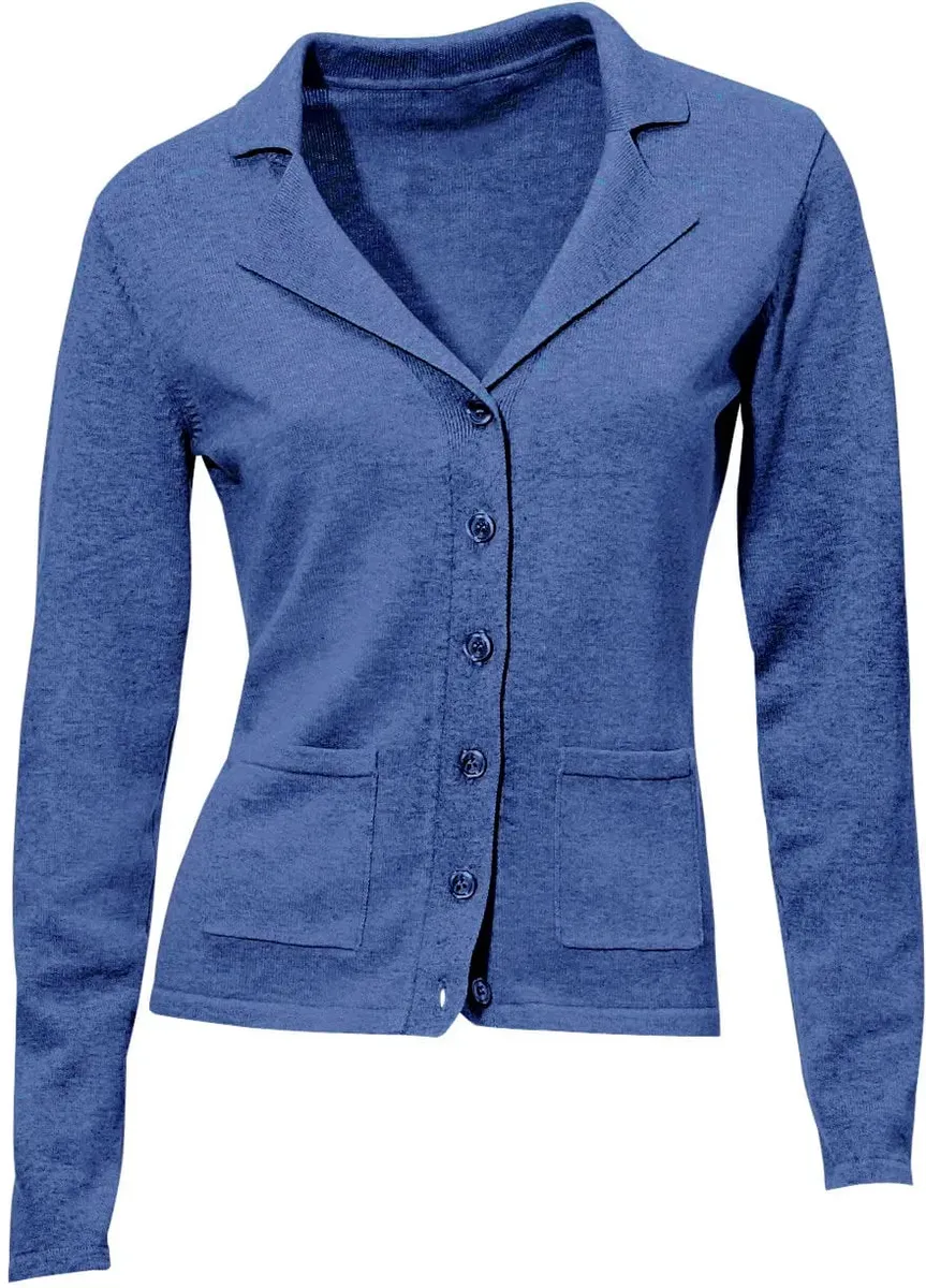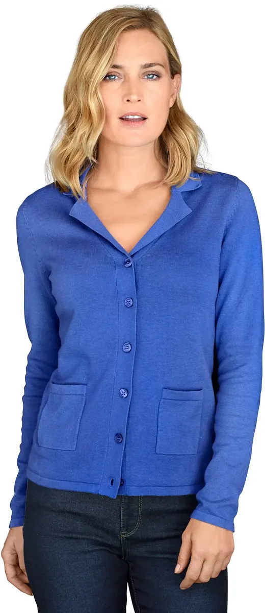 Жакет тонкой вязки Мягкий тонкий трикотаж, облегающий фигуру, с воротником с лацканами, застежкой на пуговицы и длинными рукавами. 100% хлопок. Машинная стирка.