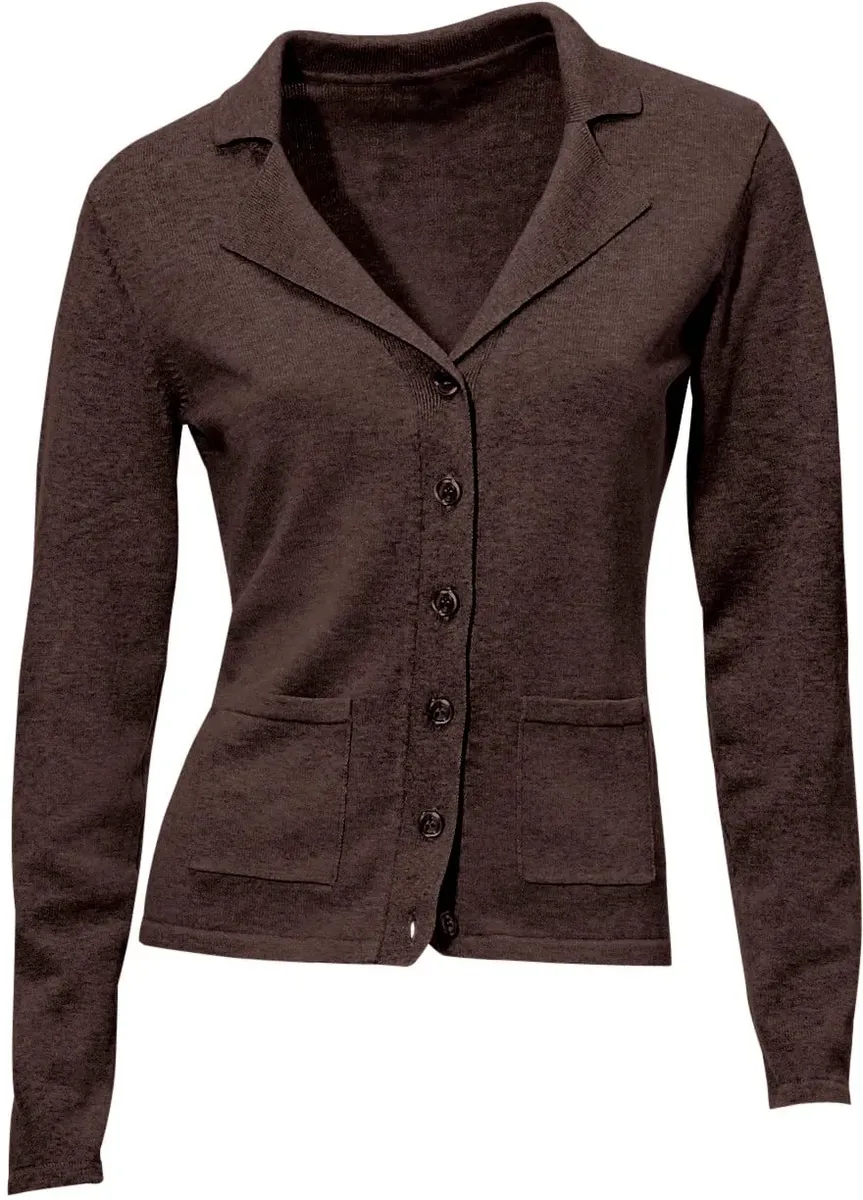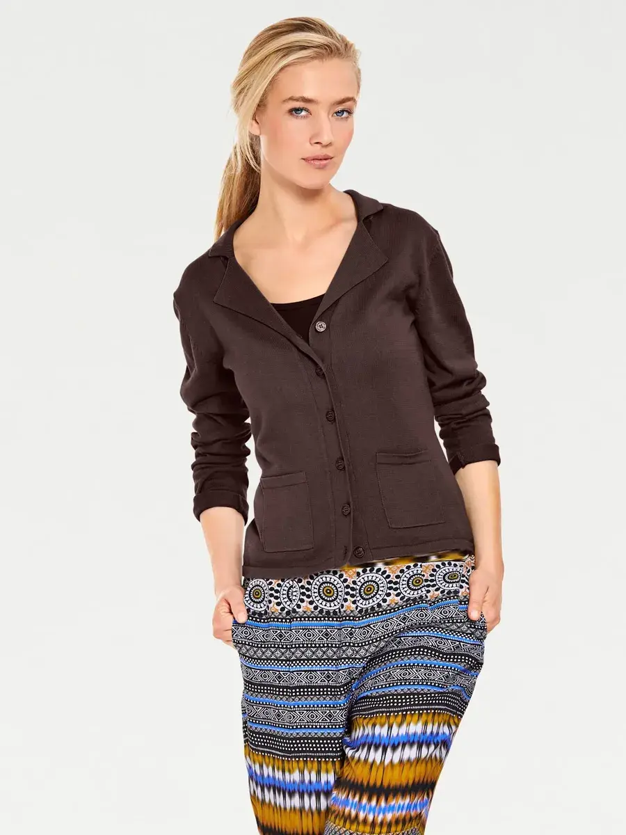 Жакет тонкой вязки Мягкий тонкий трикотаж, облегающий фигуру, с воротником с лацканами, застежкой на пуговицы и длинными рукавами. 100% хлопок. Машинная стирка.
