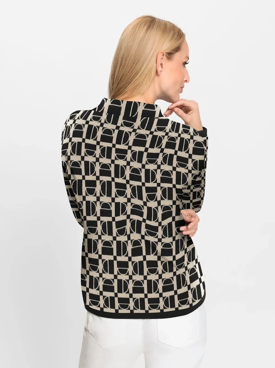 Жаккардовый свитер привлекает внимание привлекательным графическим дизайном. С воротником стойкой и длинными рукавами. Мягкость на ощупь благодаря эластичному тонкому трикотажу. 80% вискоза, 20% полиамид. Машинная стирка.