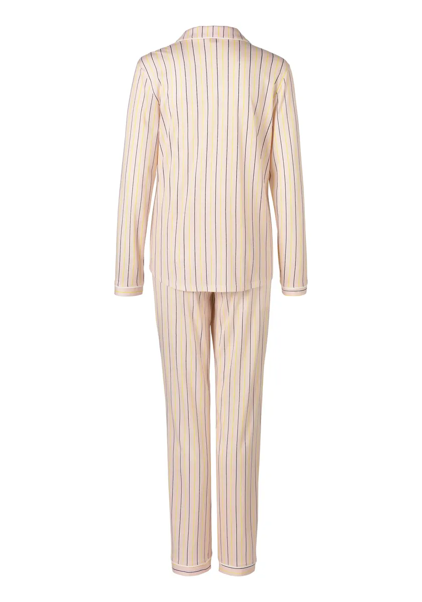 Классическая пижама с воротником с лацканами, планкой на пуговицах во всю длину, нагрудным карманом и контрастной окантовкой. Длинные пижамные брюки с эластичным поясом на кулиске. Приятное качество хлопка и вискозы.