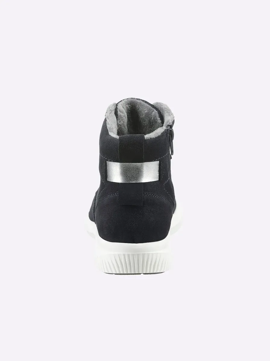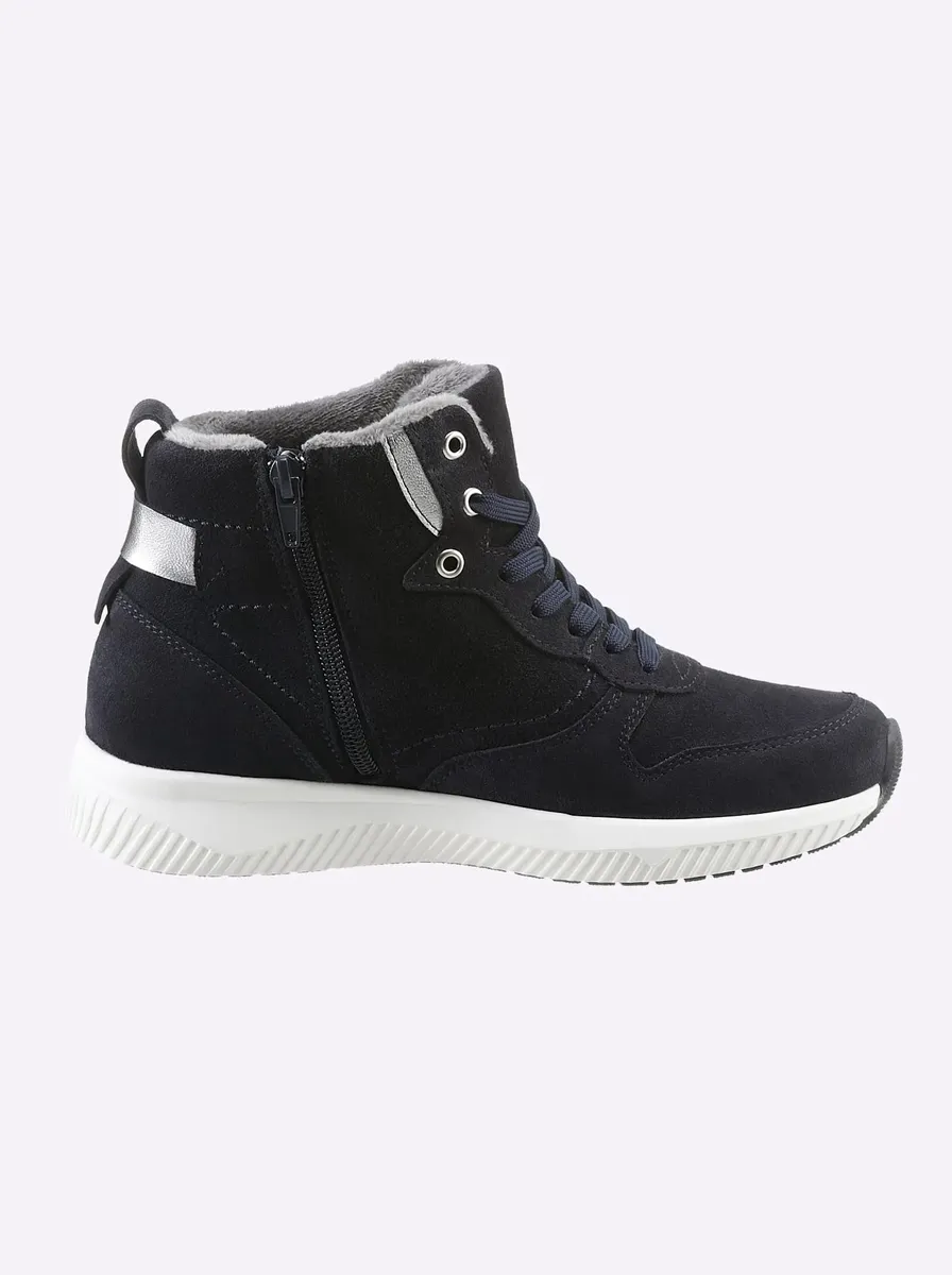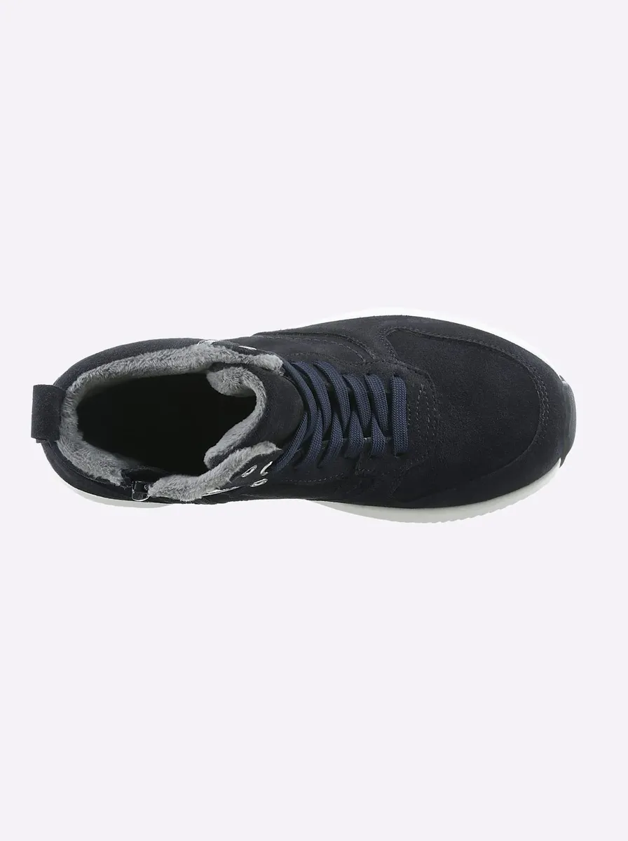 Кроссовки производства Португалии. С высоким комфортом при ношении. Изготовлены из мягкой яловой замши, со съемной стелькой и амортизацией ступней. Шнуровка, молния. Теплая подкладка. Текстильная стелька. Высота плато ок. 20 мм. Высота каблука около 30 мм.