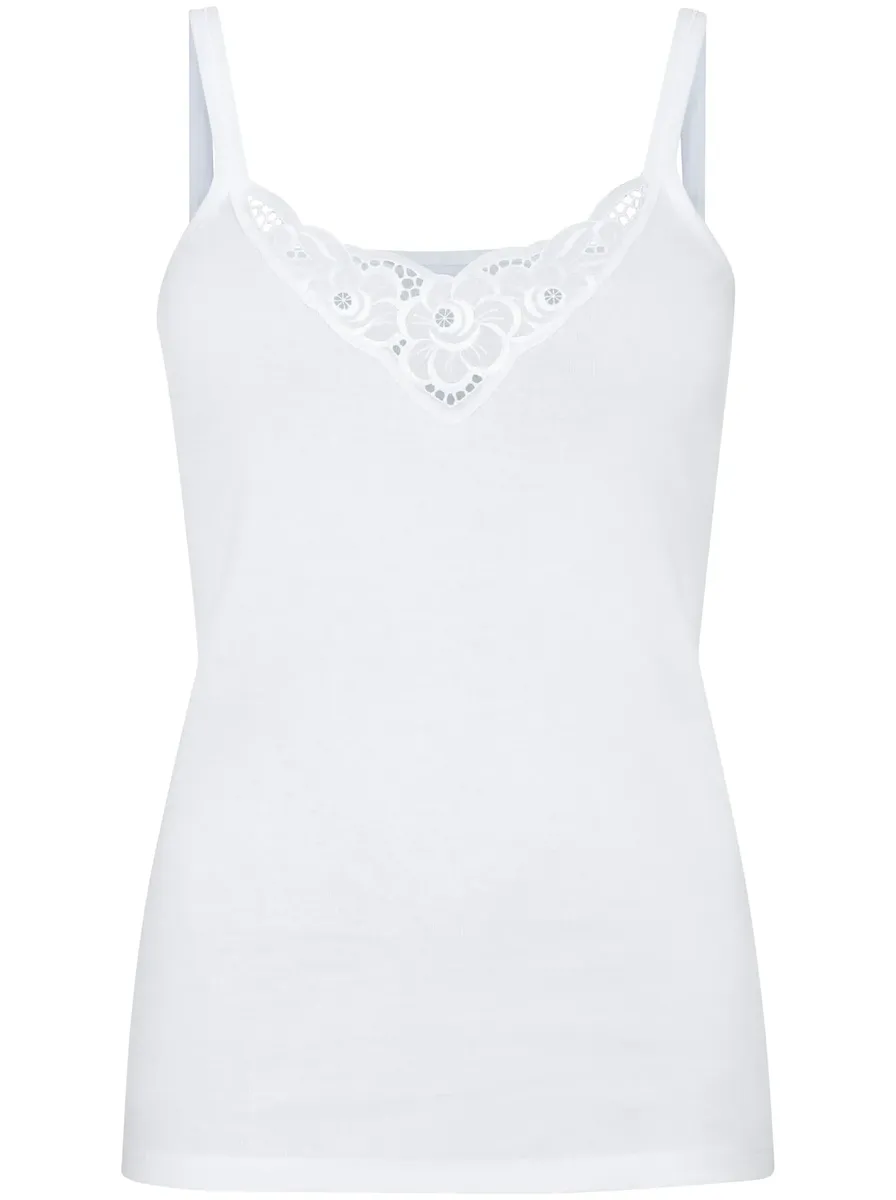 Батистовый мотив в зоне декольте делает эту майку из васпура такой привлекательной. Элегантные блестящие швы на бретелях. Удобные тонкие ребра. Сертифицированный продукт OCS. 100% хлопок.
