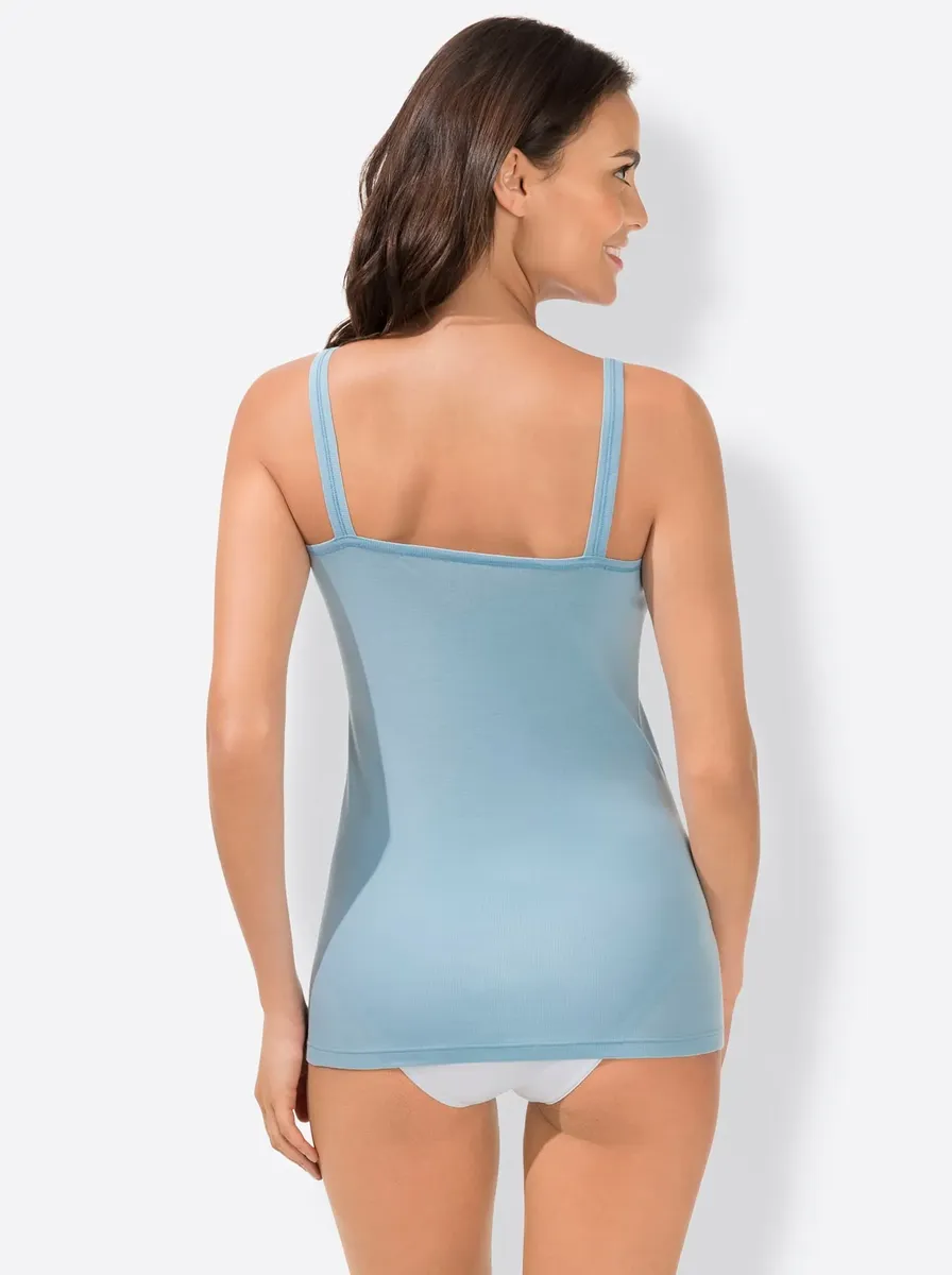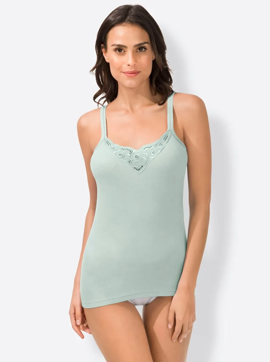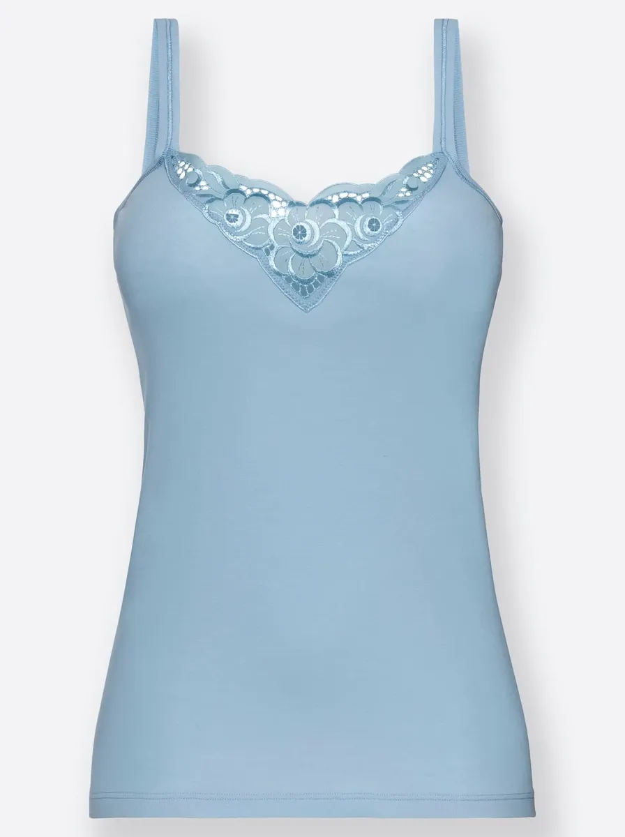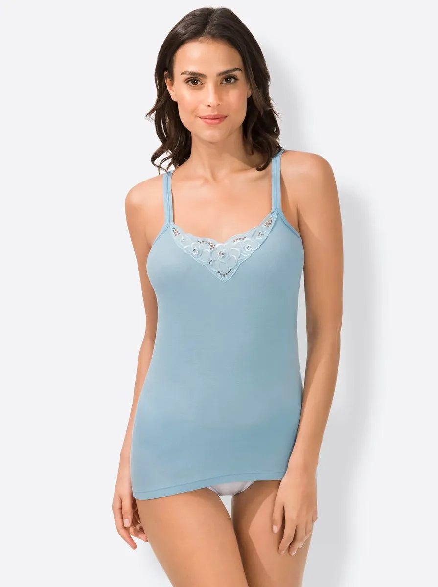Батистовый мотив в зоне декольте делает эту майку из васпура такой привлекательной. Элегантные блестящие швы на бретелях. Удобные тонкие ребра. Сертифицированный продукт OCS. 100% хлопок.
