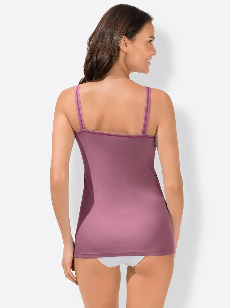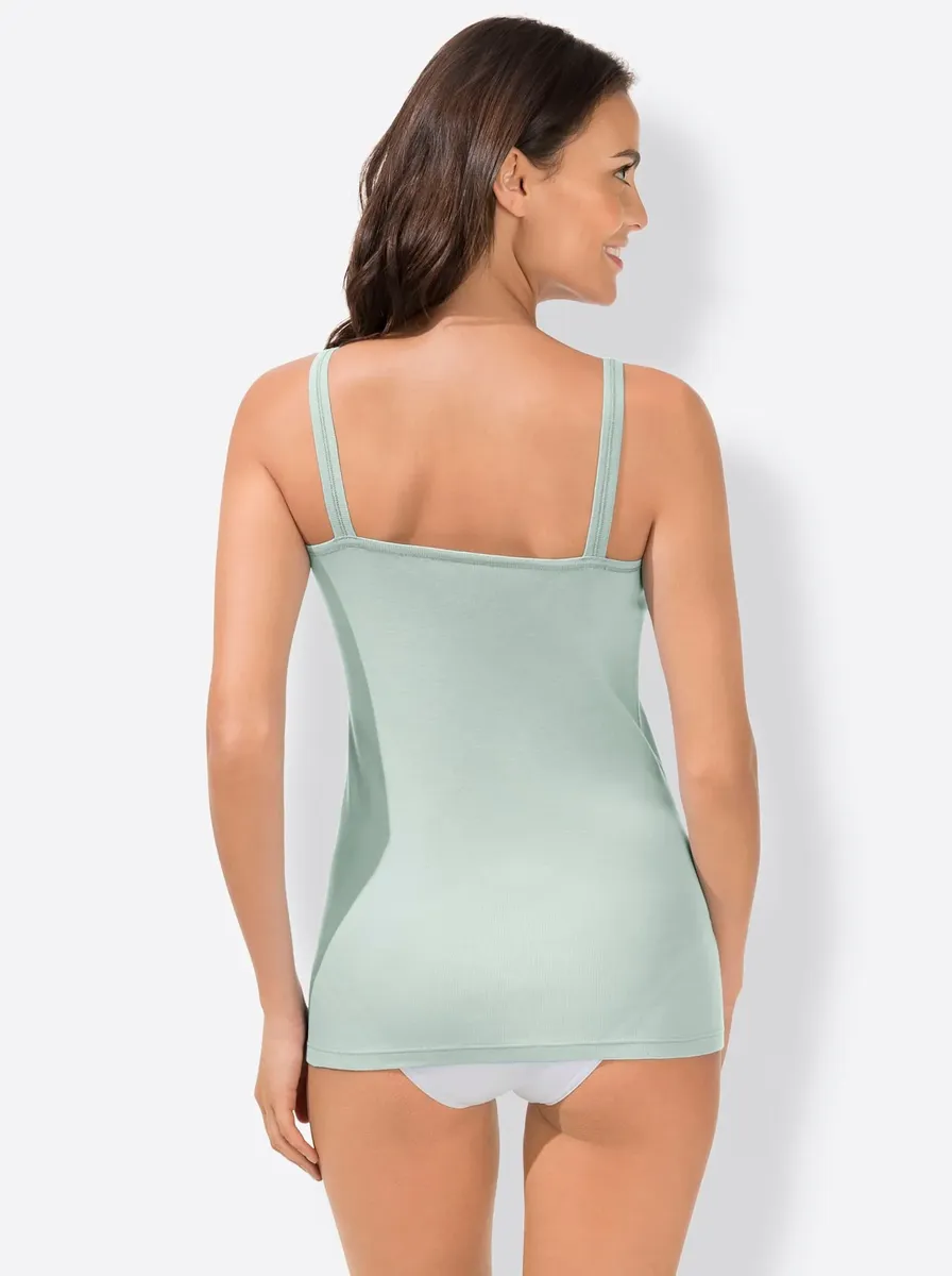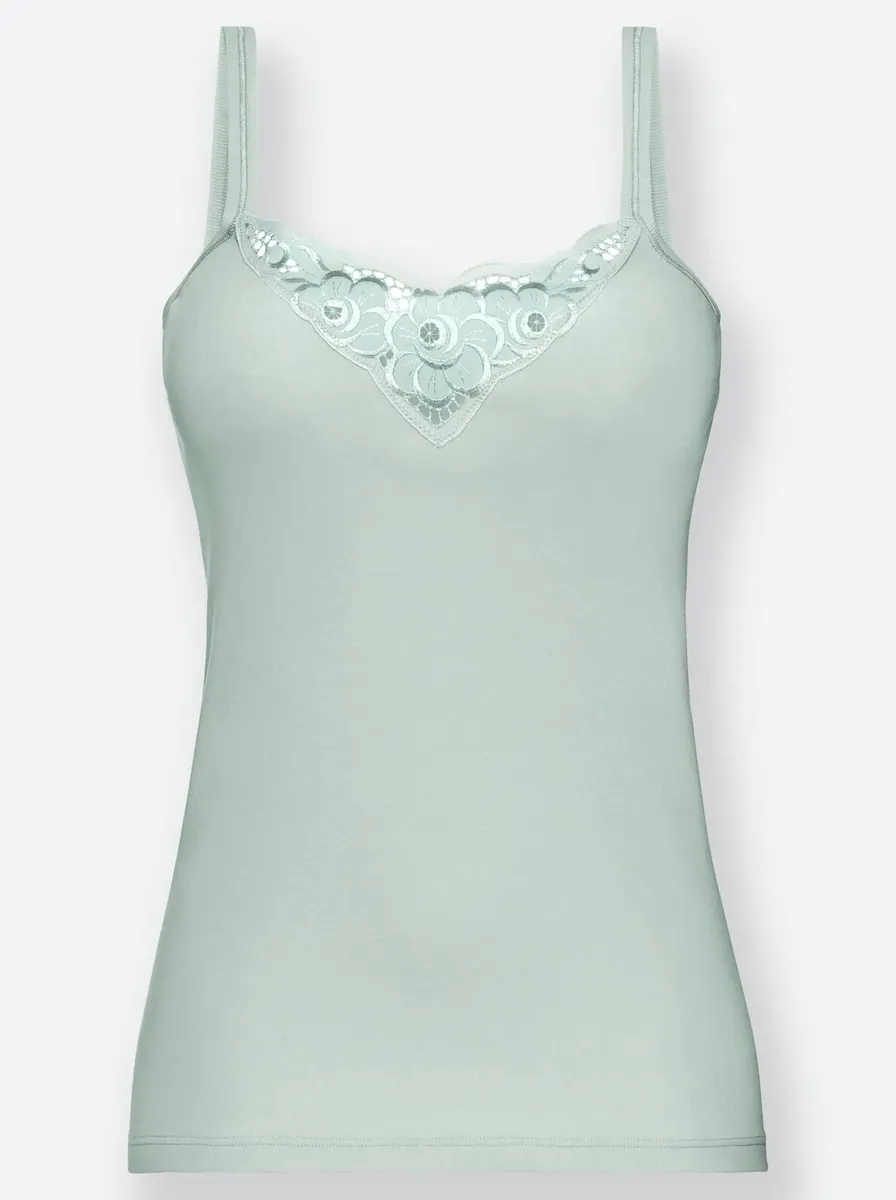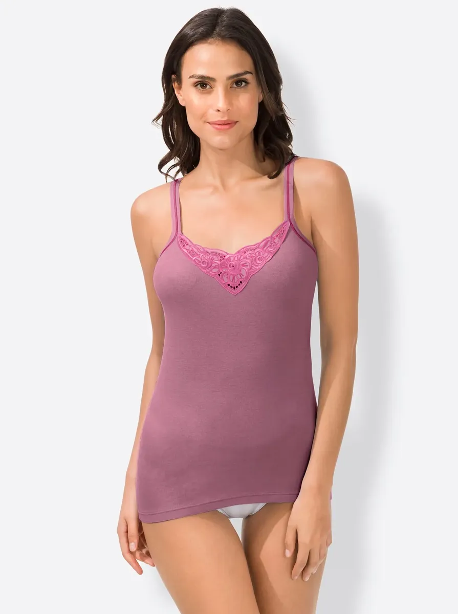Батистовый мотив в зоне декольте делает эту майку из васпура такой привлекательной. Элегантные блестящие швы на бретелях. Удобные тонкие ребра. Сертифицированный продукт OCS. 100% хлопок.