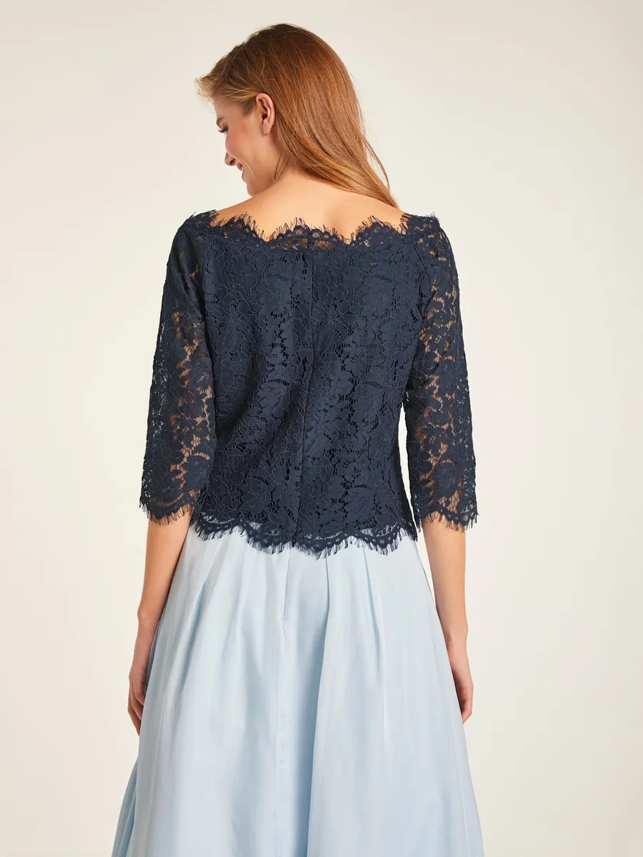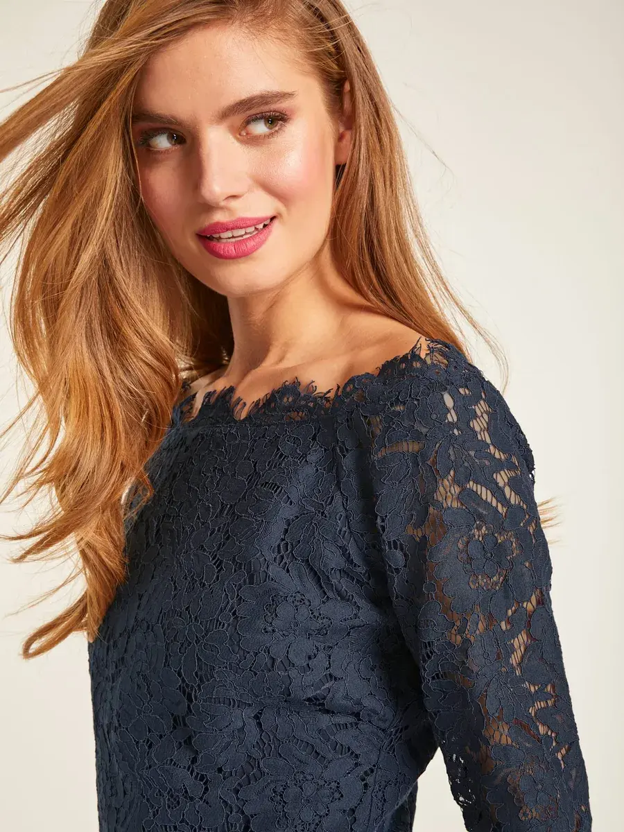 Кружевная блузка с элегантным кружевом. Частично прозрачный. Женственный стиль на многие случаи жизни. Рукава 3/4. Застежка-молния сзади. 55% полиэстер, 45% полиамид. Подкладка: 97% полиэстер, 3% эластан. Машинная стирка.