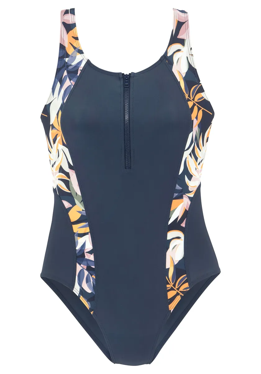 Купальник Ласкана. Со вставками с цветочным принтом по бокам. С вырезом сзади. Застежка-молния спереди. Спортивный круглый вырез. Удобное и эластичное качество.