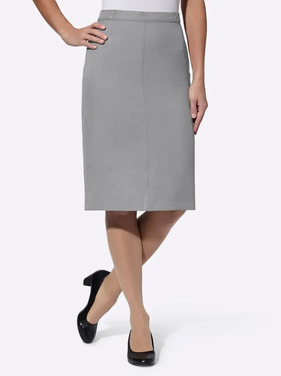 Классическая юбка из аккуратной ткани с начесом внутри. Узкий крой, эластичный пояс сзади, гладкий клапан спереди с декоративными заклепками и потайной разрез сзади. 100% полиэстер. Машинная стирка.