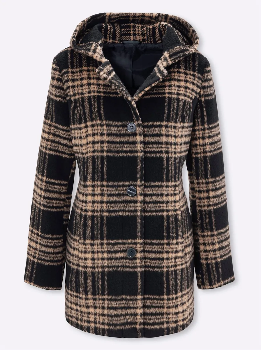Куртка в красивую клетку с капюшоном, большими черными пуговицами и двумя врезными карманами. Венские швы для оптимальной посадки. 70 % полиэстер, 20 % полиакрил, 4 % хлопок, 3 % полиамид, 3 % вискоза. Подкладка: 100% полиэстер. Машинная стирка.