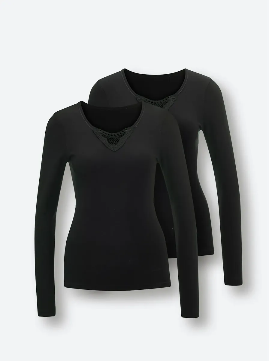 Благодаря мягкому начесу на внутренней стороне этот спенсер с длинными рукавами в двойной упаковке станет настоящим фаворитом! С круглым вырезом и элегантным мотивом из батиста. Задняя часть удлинена. 100% хлопок (OCS).