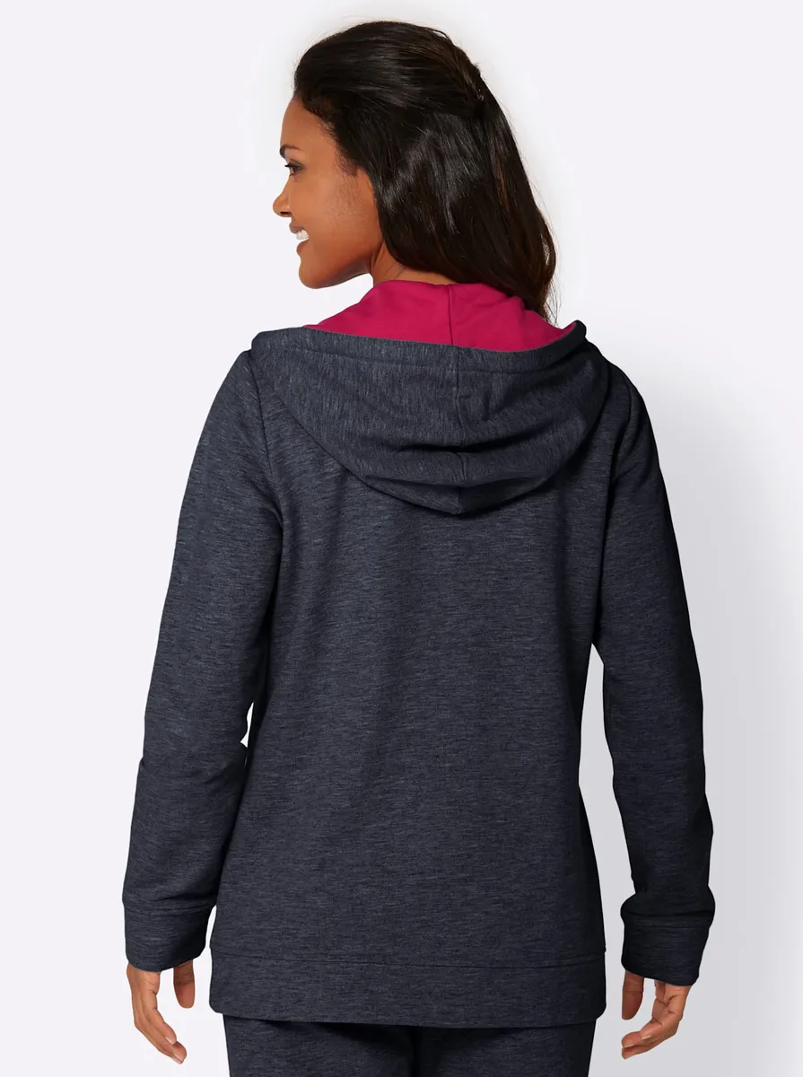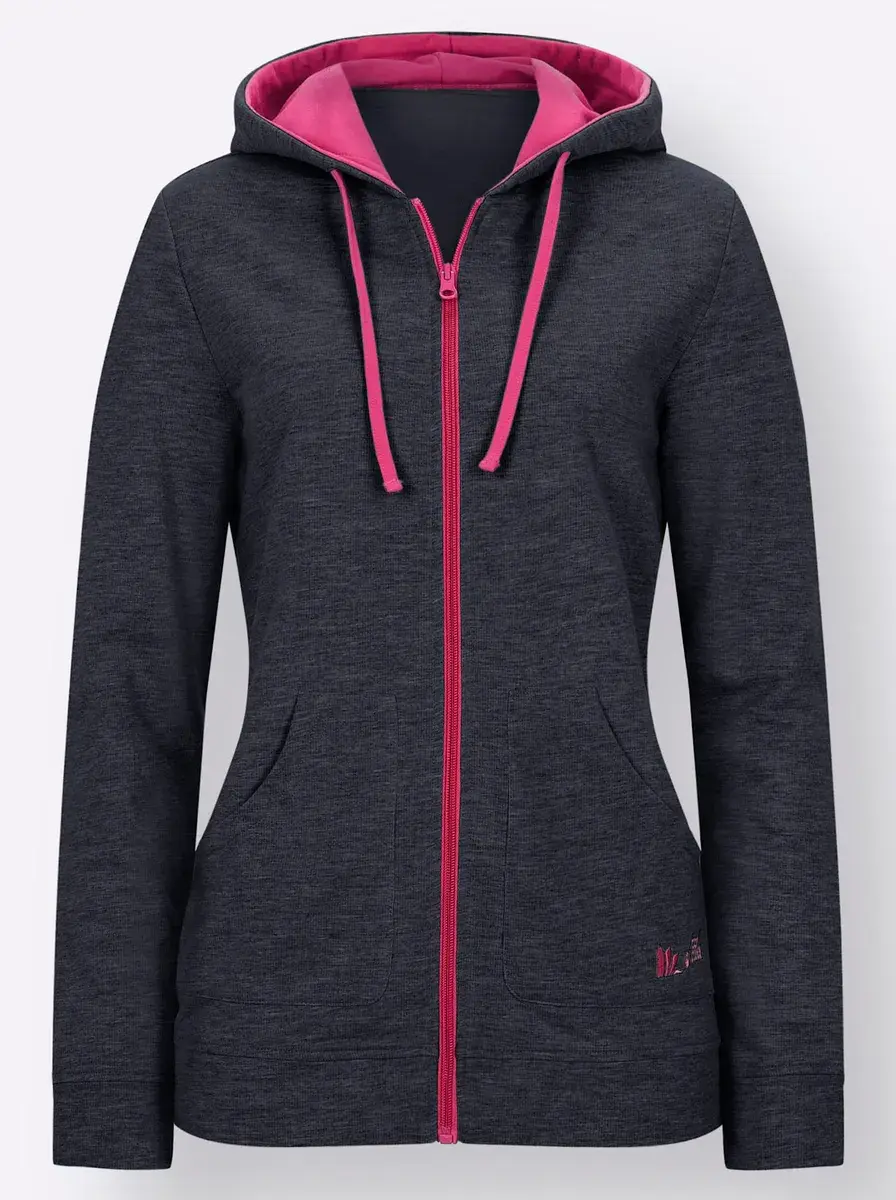 Куртка играет акцентами! Внутренняя часть капюшона с кулиской и завязками контрастного цвета, как и вставка вдоль молнии по всей длине. С 2 модными карманами-кенгуру и приятной вышивкой. Удобный спортивный костюм. 60% хлопок, 40% полиэстер. Машинная стирка.