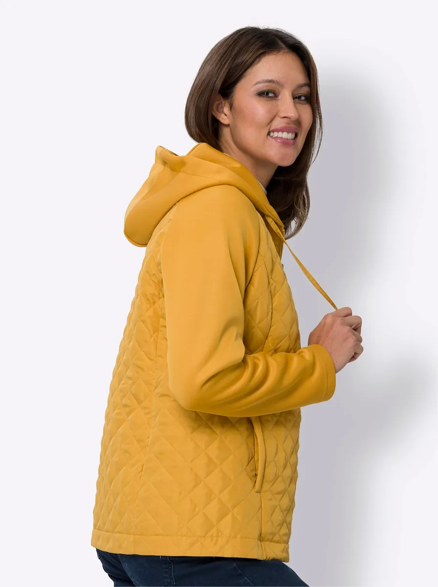 Куртка из приятного сочетания материалов. с аккуратным ромбовидным стеганым узором, капюшоном на кулиске и застежкой-молнией.