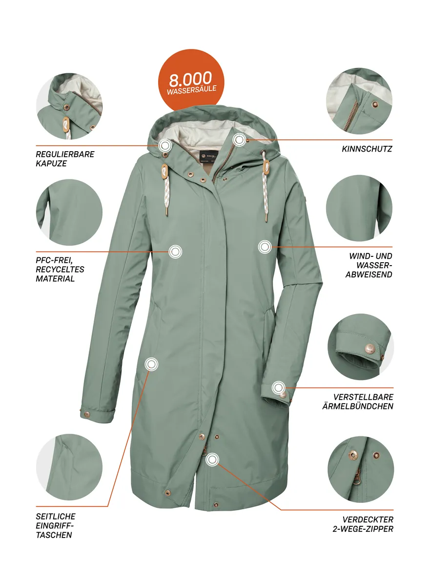 Женская парка из софтшелла с капюшоном от G.I.G.A. DX идеален для переходного периода и прохладных летних дней. Он защищает от ветра и дождя благодаря водному столбу высотой 8000 мм и в то же время является воздухопроницаемым. Куртка имеет два боковых кармана и внутренний карман для мобильного телефона. Подол и манжеты регулируются. Двусторонняя молния открывается сверху и снизу и обеспечивает свободу движений. Визуально парка впечатляет своим непринужденным видом, длинным кроем и потайной молнией. killtec постоянно стремится сделать свои коллекции более экологичными и ориентированными на будущее. killtec все больше полагается на более ответственные производственные процессы. Поэтому эта парка пропитана веществами, не содержащими фтора, и изготовлена ​​из переработанных материалов.