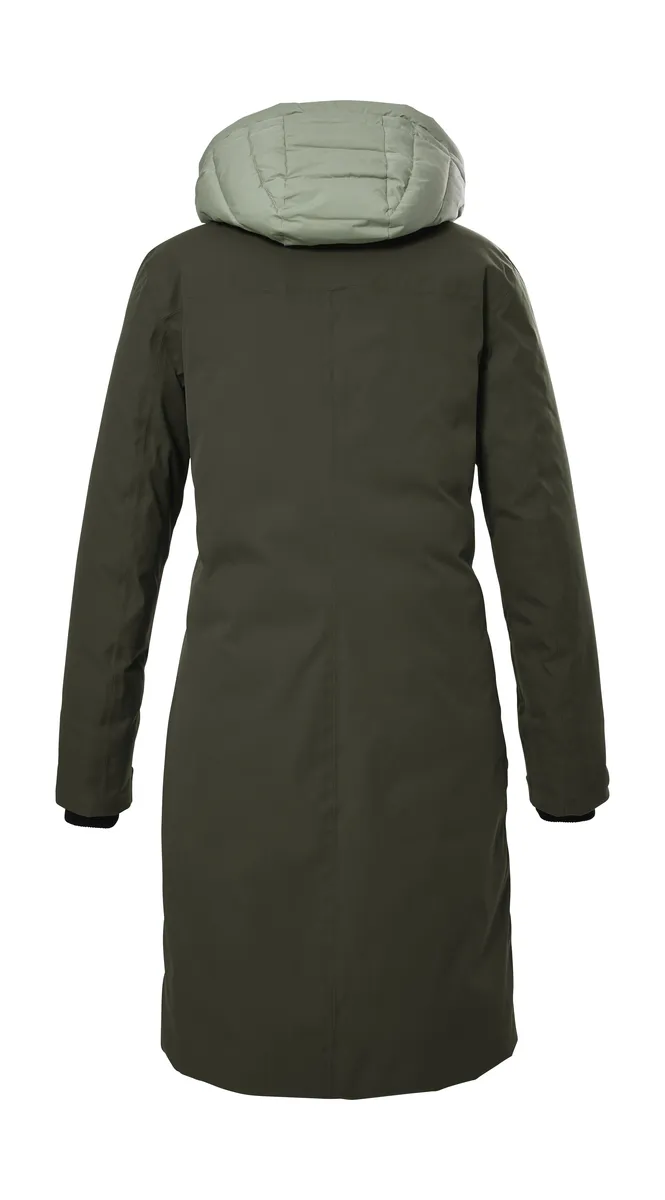 Женская парка на подкладке из новой коллекции Ark Protection от G.I.G.A DX впечатляет сочетанием высокой функциональности и повседневного городского стиля. Парка имеет сварные швы, водонепроницаемую молнию и на 100% водонепроницаема при водяном столбе 10 000 мм и в то же время особенно воздухопроницаема (5 000 г/м²/24 часа). Капюшон при необходимости можно отрегулировать и застегнуть. Двусторонняя и боковые молнии обеспечивают свободу движений. Передняя молния оснащена практичной защитой подбородка. Два кармана закрываются на молнии, чтобы ничего не потерялось. Внутренний карман обеспечивает дополнительное место для хранения. Для killtec особенно важно сделать коллекции более устойчивыми и ориентированными на будущее. killtec все больше полагается на более ответственные производственные процессы. Поэтому эта парка пропитана веществами, не содержащими фтора, и частично изготовлена ​​из переработанного материала.