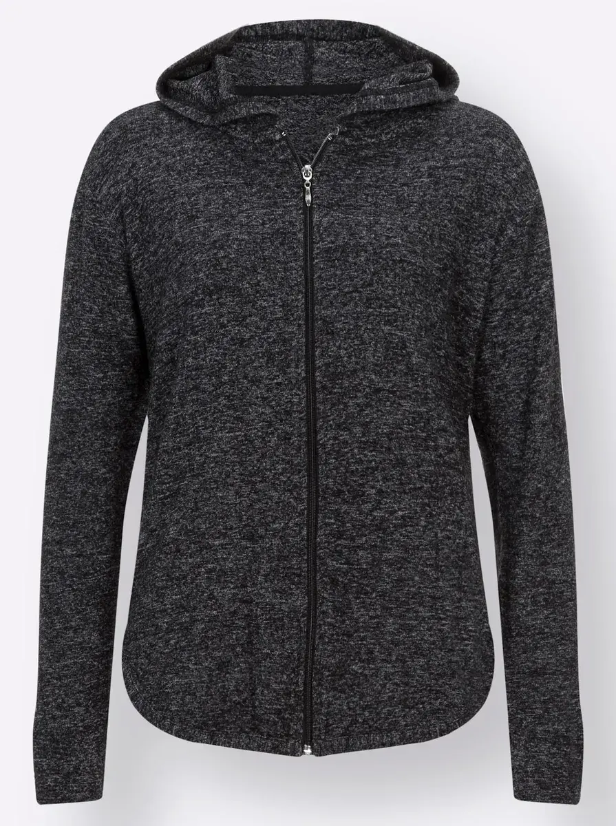 Куртка свободного, легкого кроя: очень удобная, приятная, мягкая, согревающая, тонкой вязки. С капюшоном, молнией во всю длину, закругленным краем и эластичными манжетами. 80% вискоза, 15% полиэстер, 5% эластан.