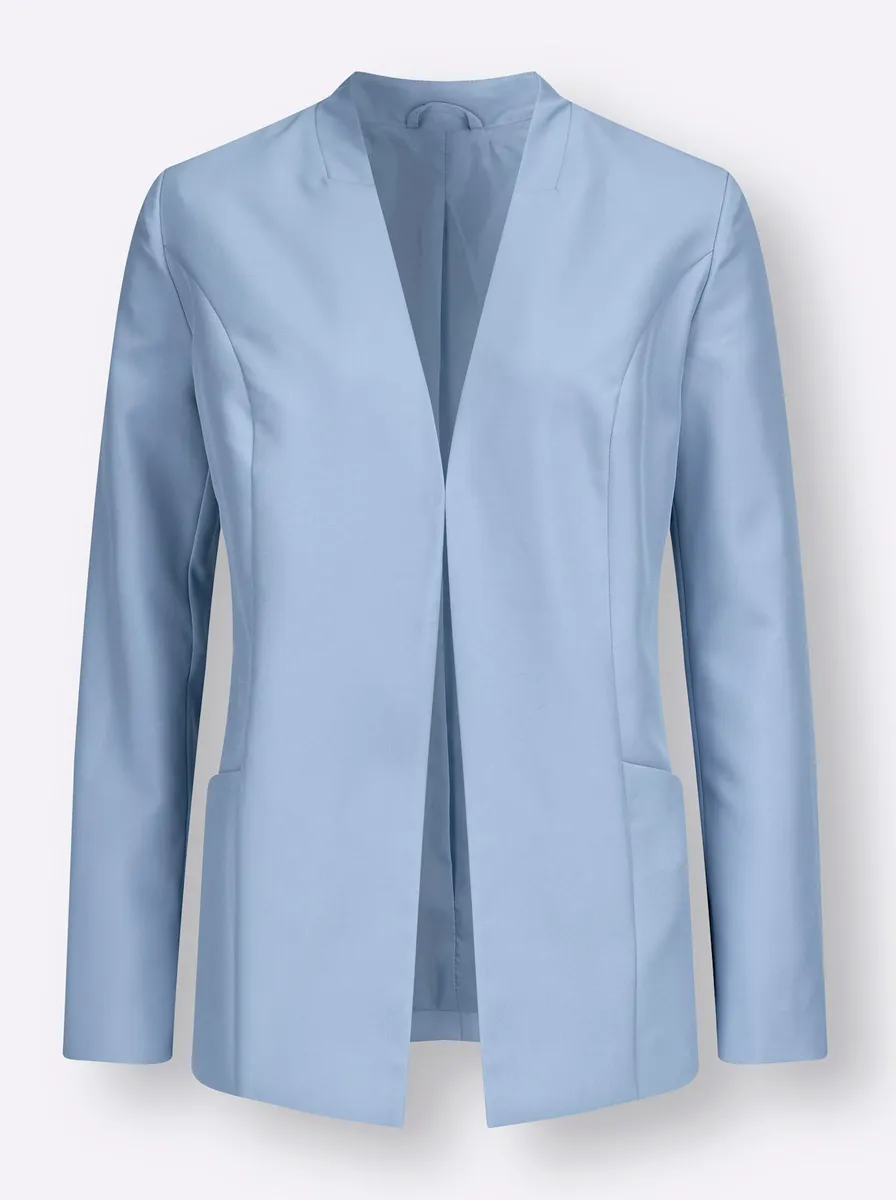 Блейзер для изысканных. Особо мягкое качество. Модный воротник-стойка и застежка на крючки. С 2 боковыми карманами. Формирование венских швов. 100% полиэстер. Подкладка: 100% полиэстер. Машинная стирка.