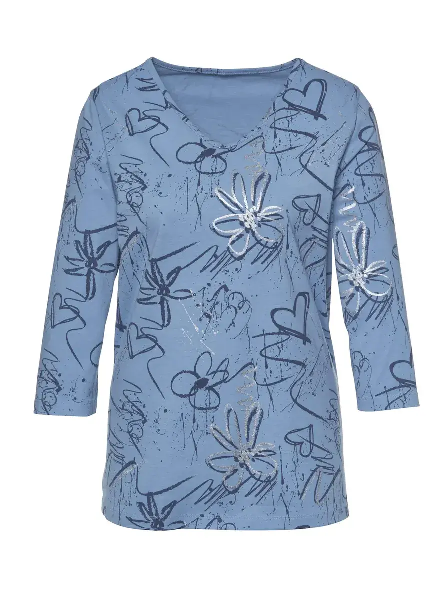 Блестящие перспективы на каждый день: рубашка с принтом в виде сердца и цветов, украшенным принтом из серебристой фольги. С V-образным вырезом и рукавами 3/4. 100% хлопок. Машинная стирка.