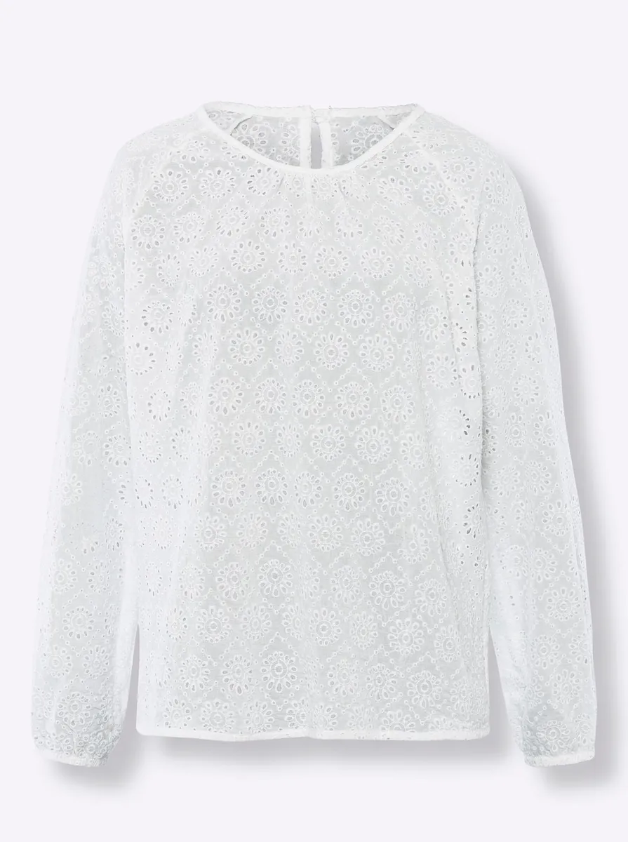 Блуза Воздушная, легкая и удобная, с тонкой вышивкой по всей поверхности. Круглый вырез сзади на пуговице и разрез для застежки. Длинные рукава с эластичными манжетами. Поддержите инициативу «Хлопок, сделанный в Африке». 100% хлопок. Машинная стирка.