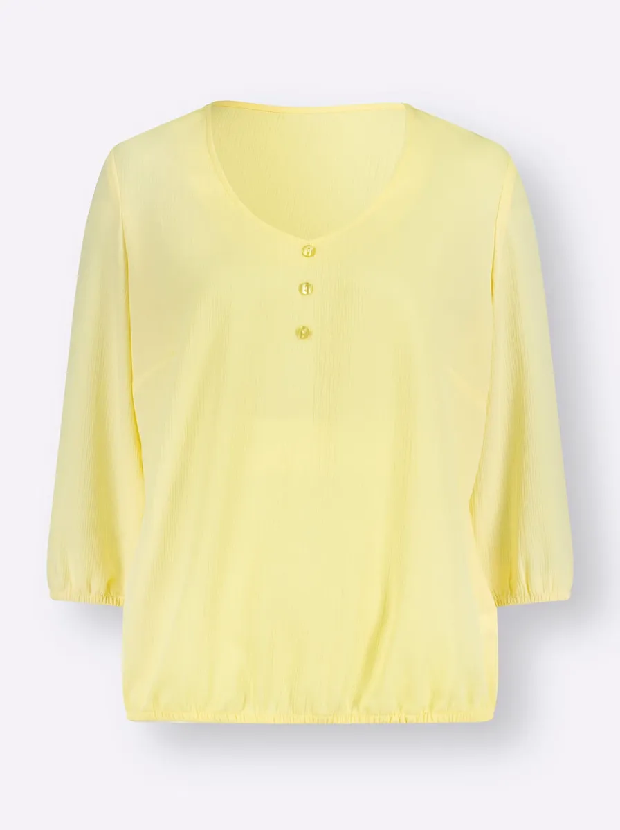 Блузка без шнуровки из легкого в уходе крепа с типичным эффектом мятости. Округленный V-образный вырез с декоративными пуговицами соответствующего цвета. Эластичные манжеты на рукавах 3/4 и подоле обеспечивают скрытую ширину. 100% полиэстер. Машинная стирка.