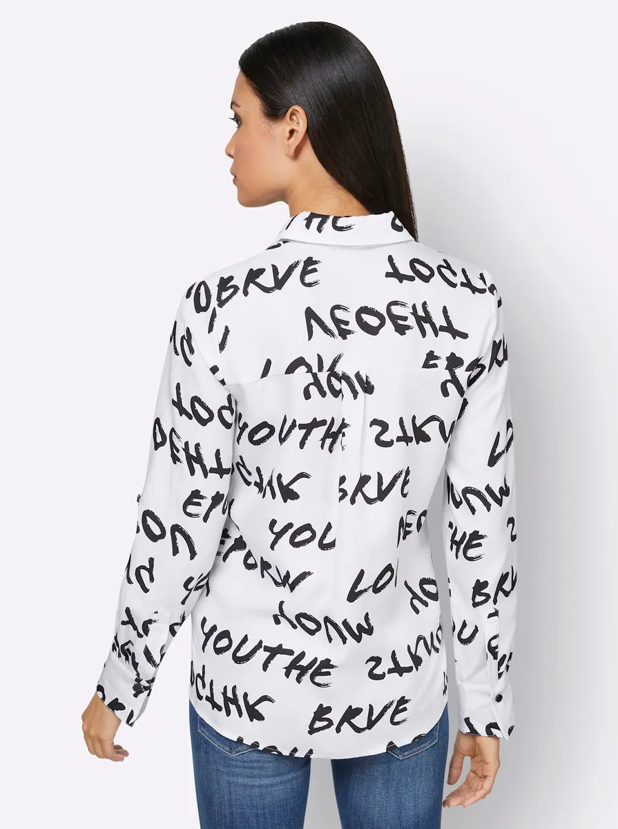 Блузка впечатляет термо- и влагоустойчивым натуральным волокном лиоцелла. Он нежный и комфортный для кожи. С рубашечным воротником, планкой на пуговицах и боковыми разрезами. Принт с надписями, также известный как леттеринг, накладные нагрудные карманы и высокие манжеты на длинных рукавах, которые можно подвернуть на 3/4 длины, добавляют модного изящества. Вытачки для груди спереди и кокетка на плечах со складками сзади обеспечивают идеальную посадку и удобную ширину. 100% лиоцелл. Машинная стирка.
