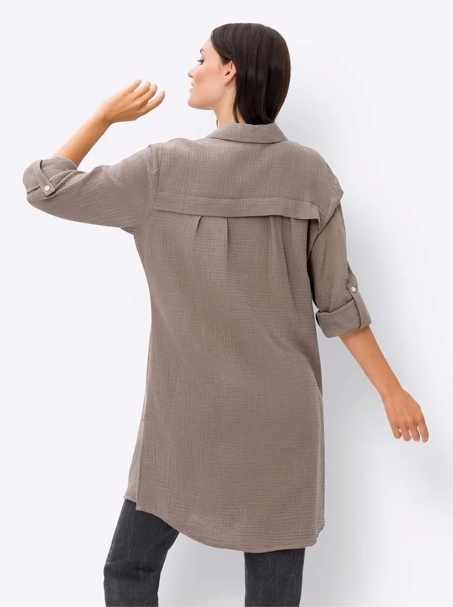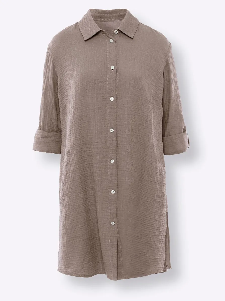 Блузка Модная универсальная модель из слегка структурированного муслина. С рубашечным воротником, планкой на пуговицах во всю длину и боковыми разрезами. Длинные рукава-фонарики с манжетами на пуговицах. Сзади со складками под кокеткой. Поддержите инициативу «Хлопок, сделанный в Африке». 100% хлопок. Машинная стирка.
