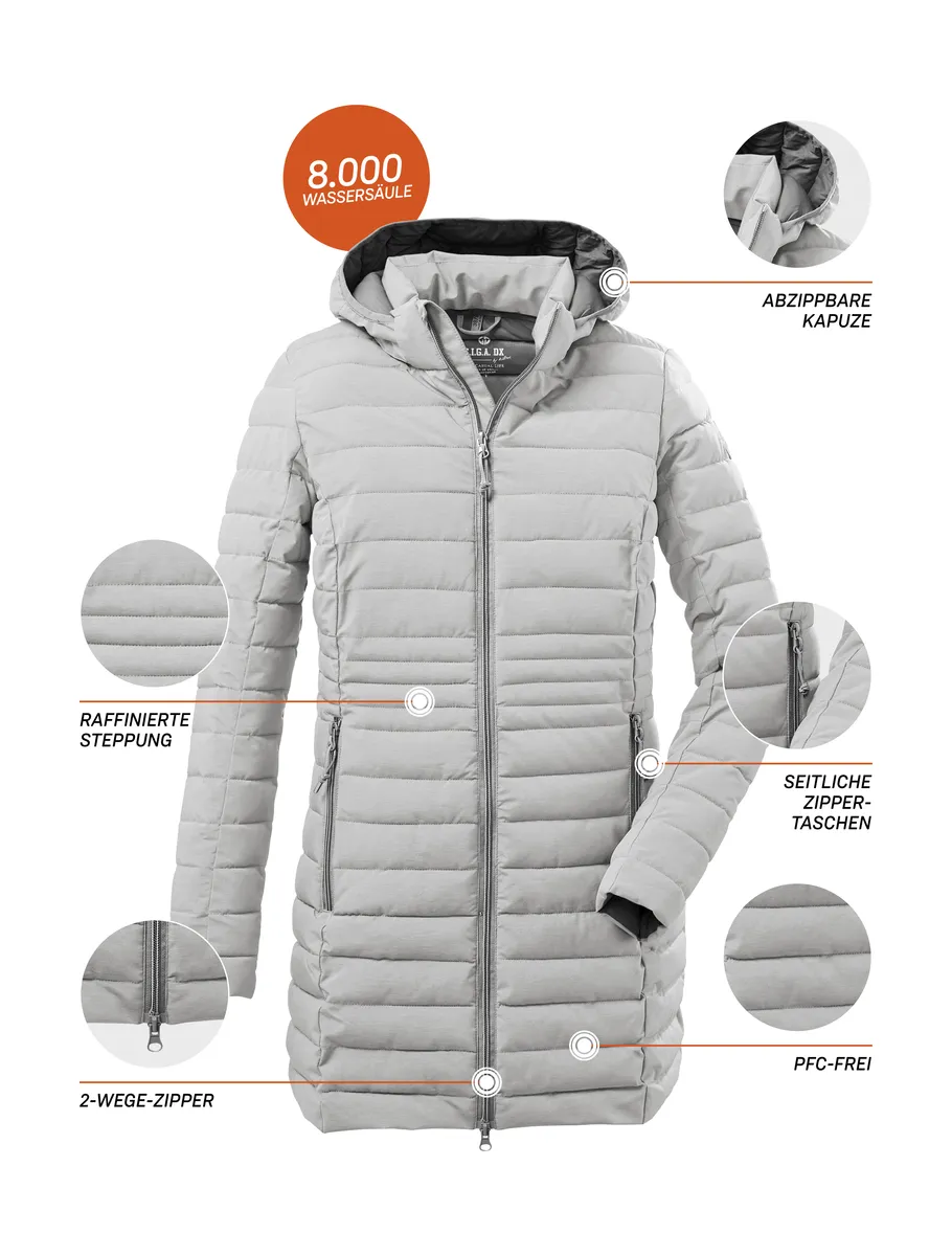 Женская функциональная парка в пуховом стиле от G.I.G.A. DX впечатляет своим тонким кроем и подчеркивающей фигуру стежкой. Стеганая парка водоотталкивающая и ветронепроницаемая (выдерживает водный столб 8000 мм) и в то же время дышащая. Отстегивающийся капюшон и высокий воротник-стойка обеспечивают дополнительную защиту от ветра и дождя. Два боковых кармана закрываются на молнии. Двусторонняя молния открывается сверху и снизу, обеспечивая свободу движений. Он также имеет практичную защиту подбородка. Для killtec особенно важно сделать коллекции более устойчивыми и ориентированными на будущее. killtec все больше полагается на более ответственные производственные процессы. Поэтому эта парка была пропитана веществами, не содержащими фтора.