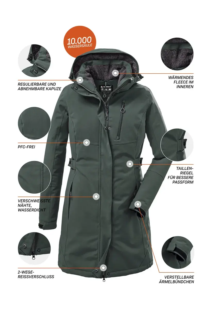 Женская функциональная парка от killtec впечатляет своим вневременным дизайном и функциональными свойствами. Он водонепроницаем и ветрозащитен благодаря сварным швам и водяному столбу высотой 10 000 мм, а также воздухопроницаем. Регулируемый капюшон при необходимости можно отстегнуть. Мягкий флис Тедди обеспечивает приятное тепло и особенно приятен. Парка также отличается практичными функциями, такими как боковая регулировка талии, регулируемые манжеты и двусторонняя молния с защитой подбородка. Боковые карманы и нагрудный карман можно закрыть на молнии, чтобы они не потерялись. Внутри также имеется практичный карман для мобильного телефона. Для killtec особенно важно сделать коллекции более устойчивыми и ориентированными на будущее. killtec все больше полагается на более ответственные производственные процессы. Поэтому эта парка была пропитана веществами, не содержащими фтора.