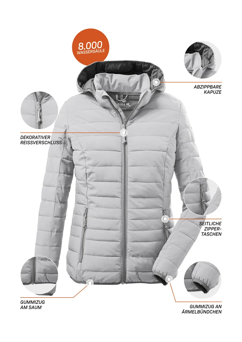 Легкая женская функциональная куртка от G.I.G.A. Модель DX, уложенная вниз, сохраняет тепло и обладает водоотталкивающими свойствами. Высокий воротник и капюшон телогрейки обеспечивают дополнительную защиту в непогоду. Капюшон при необходимости легко отстегивается и, как и низ и манжеты, эластичен. Боковые карманы имеют молнии, чтобы ничего не потерялось. Особый меланжевый вид также делает стеганую куртку визуальной изюминкой. Для killtec особенно важно сделать коллекции более устойчивыми и ориентированными на будущее. killtec все больше полагается на более ответственные производственные процессы. Поэтому эта куртка была пропитана веществами, не содержащими фтора.
