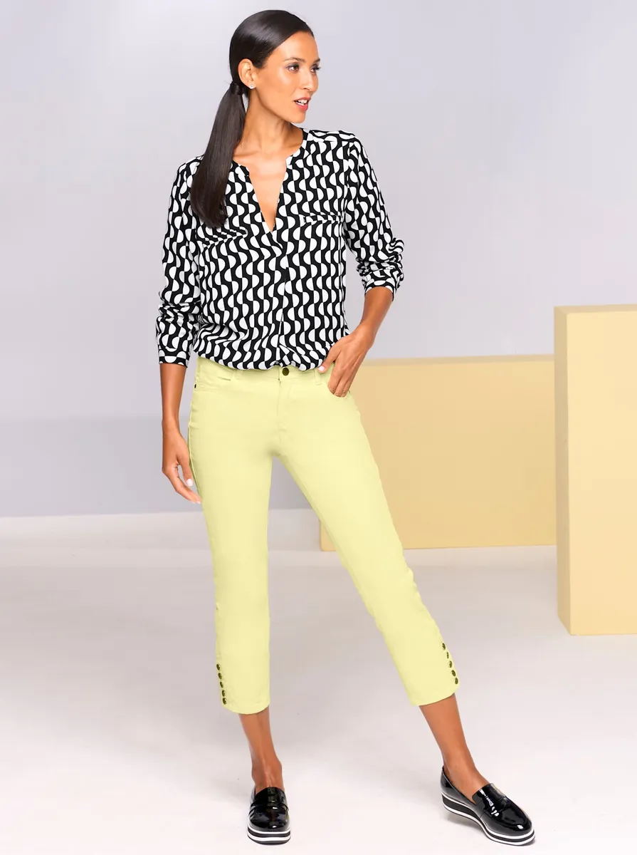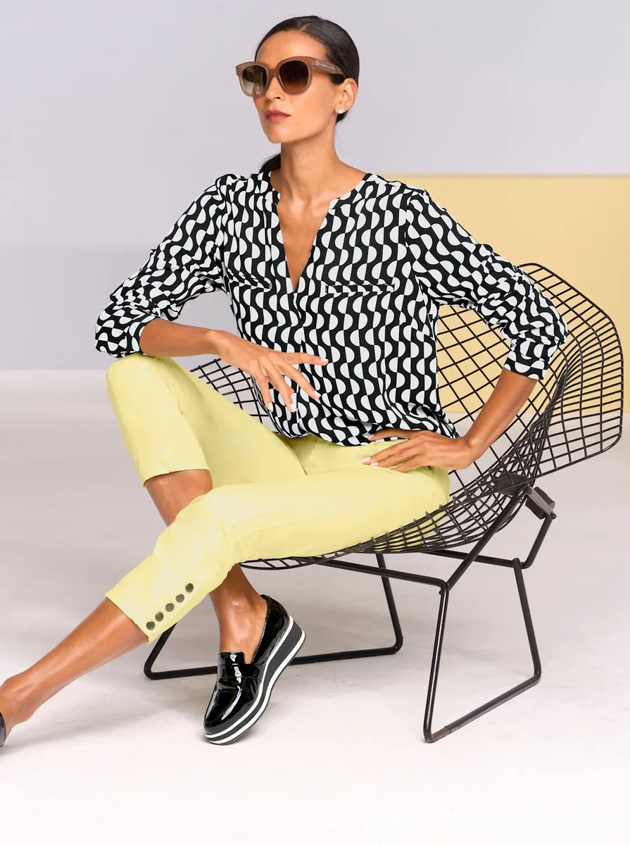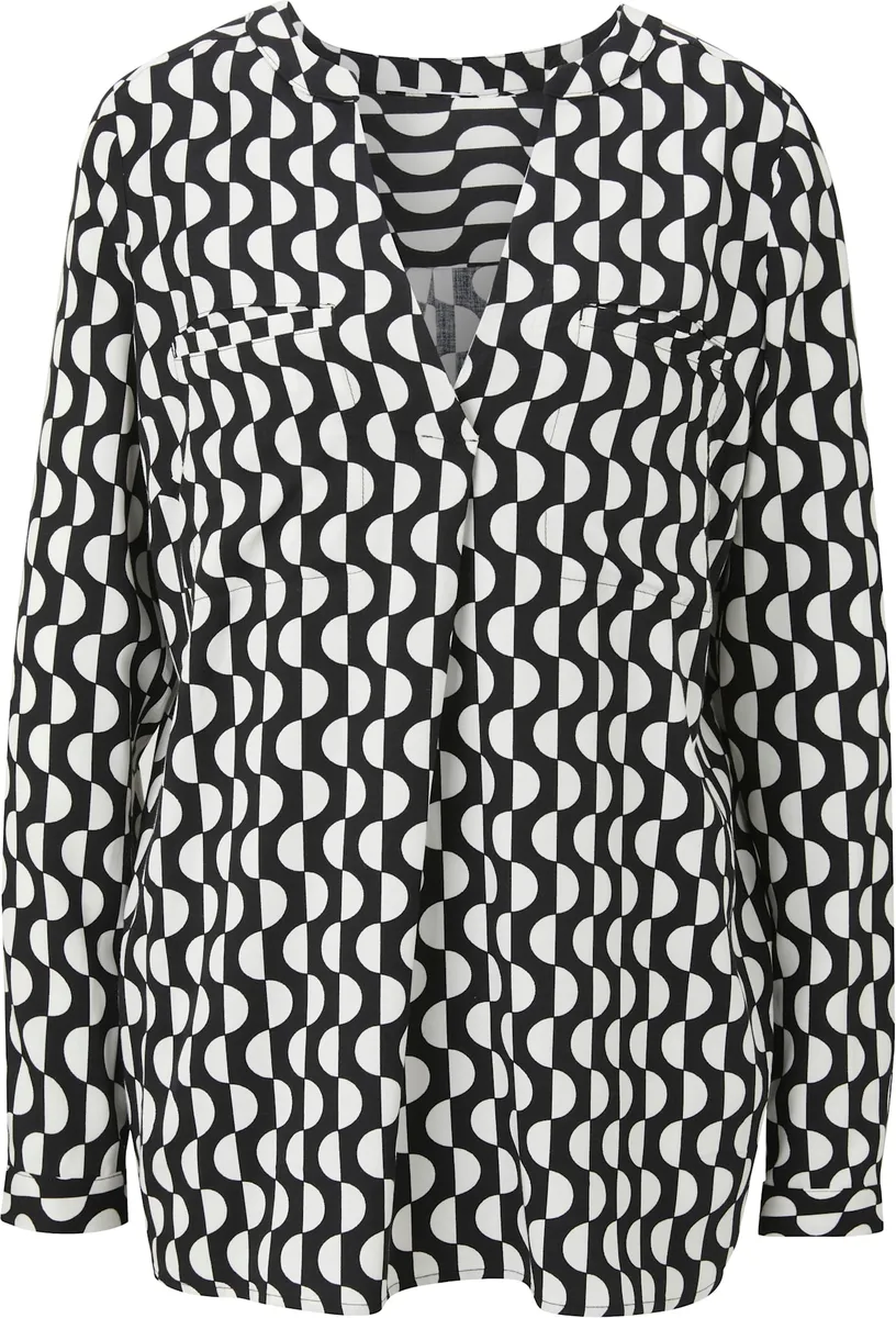 Блузка с принтом Базовая блузка без застежки струящегося качества с привлекательным принтом. Облегает фигуру, с V-образным вырезом, длинными рукавами и нагрудными карманами. Со складкой сзади для большей ширины. 100% вискоза. Машинная стирка.