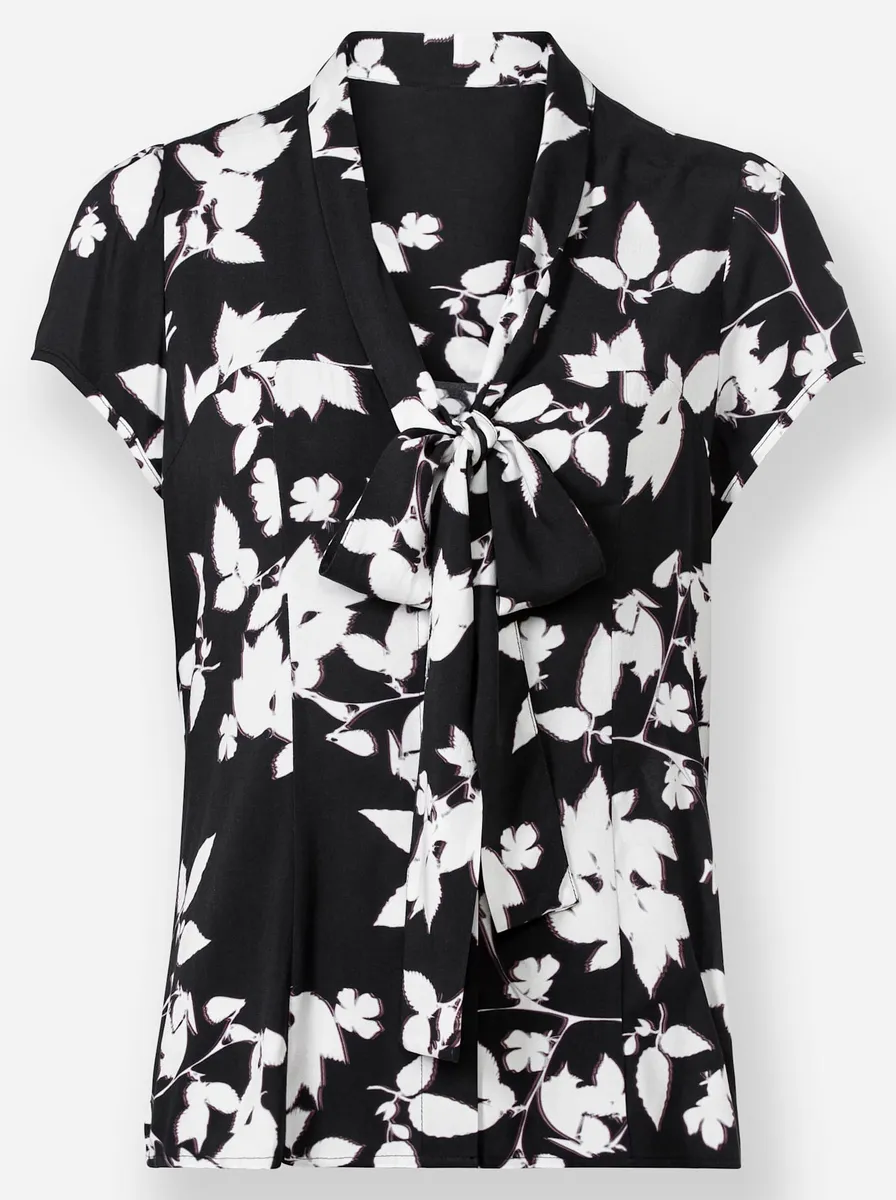 Блузка с принтом мягкого, струящегося качества и художественным принтом в виде листьев. V-образный вырез с завязкой. Слегка покрой, с фигурными разделительными швами и планкой на пуговицах. Рукава короткие, слегка присборенные, подол слегка закругленный. 100% вискоза. Машинная стирка.