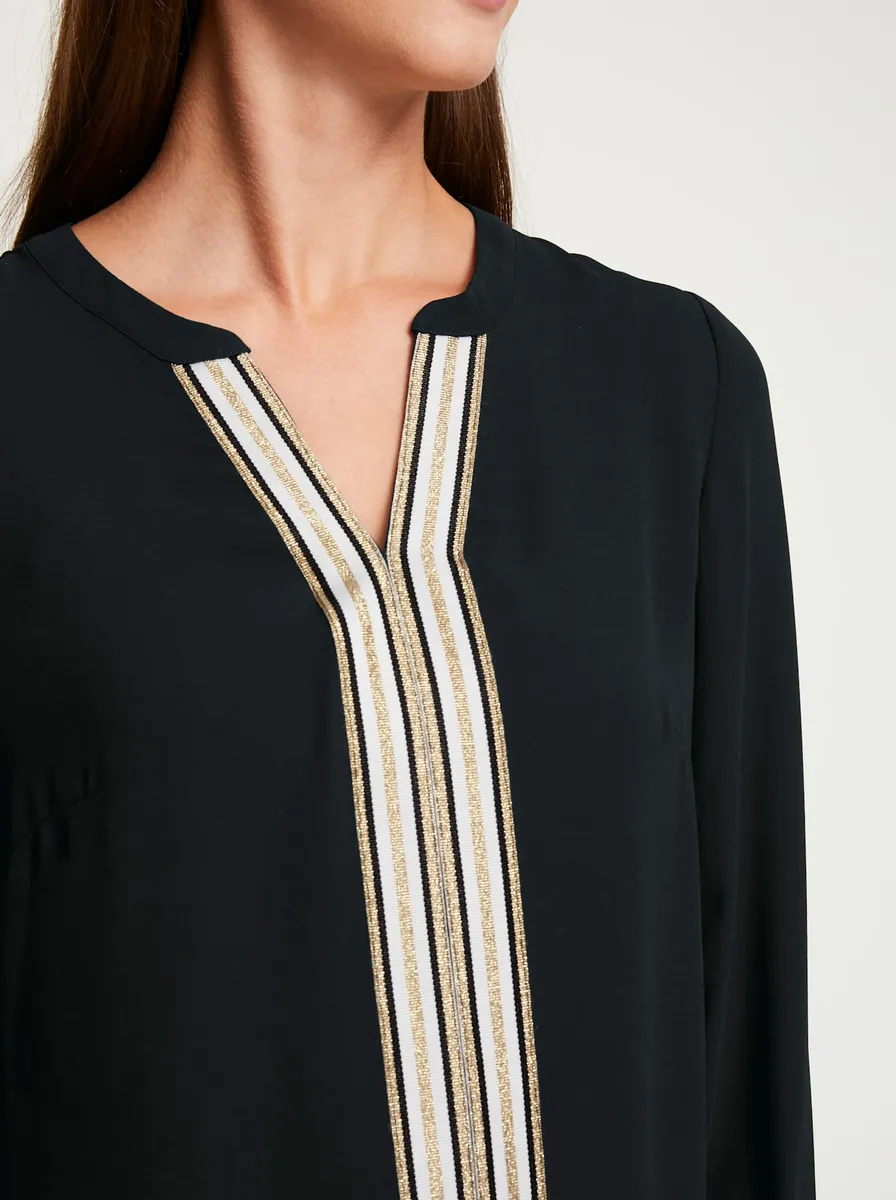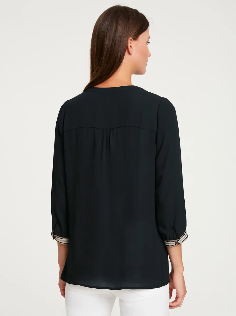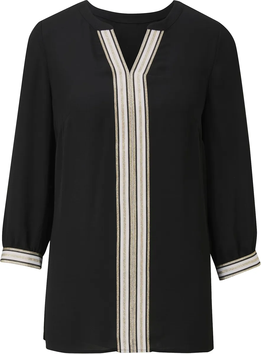Блузка Современная блузка без шнуровки со спортивной контрастной отделкой и тонкими блестящими эффектами. Прилегает к фигуре, с пуговицей на V-образном вырезе и рукавами 3/4. 100% полиэстер.