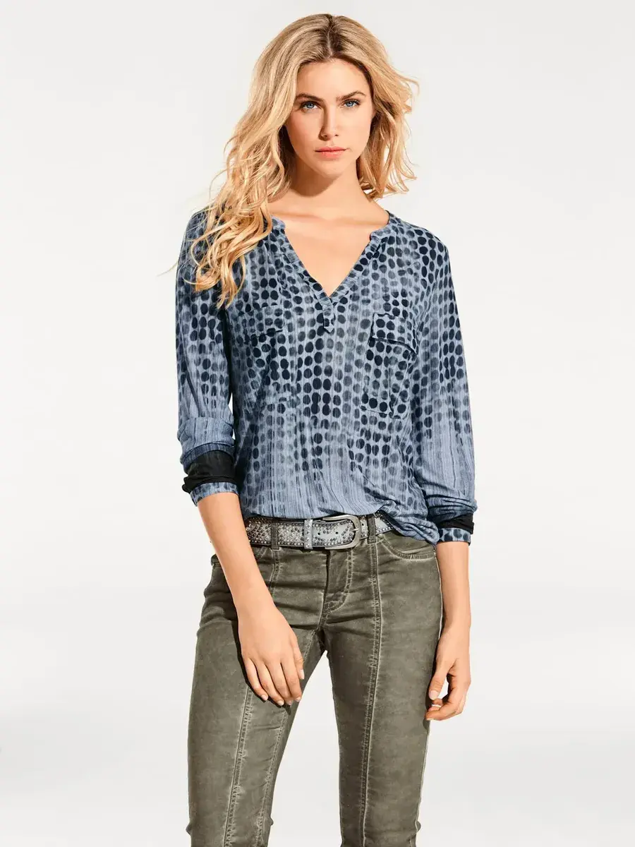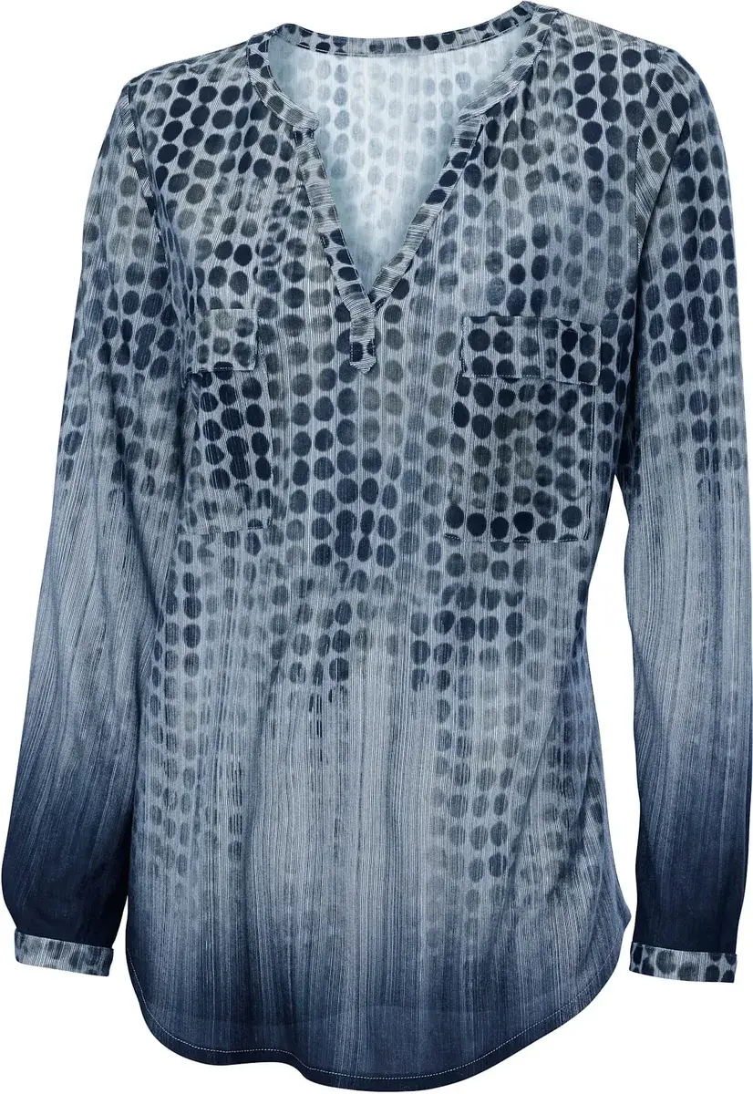 Блузка-рубашка в модном точечном дизайне. Изготовлен из тонкого струящегося материала. Сзади отрежьте немного длиннее. Подходит для повседневного использования и офиса. Накладные карманы. 100% вискоза. Машинная стирка.