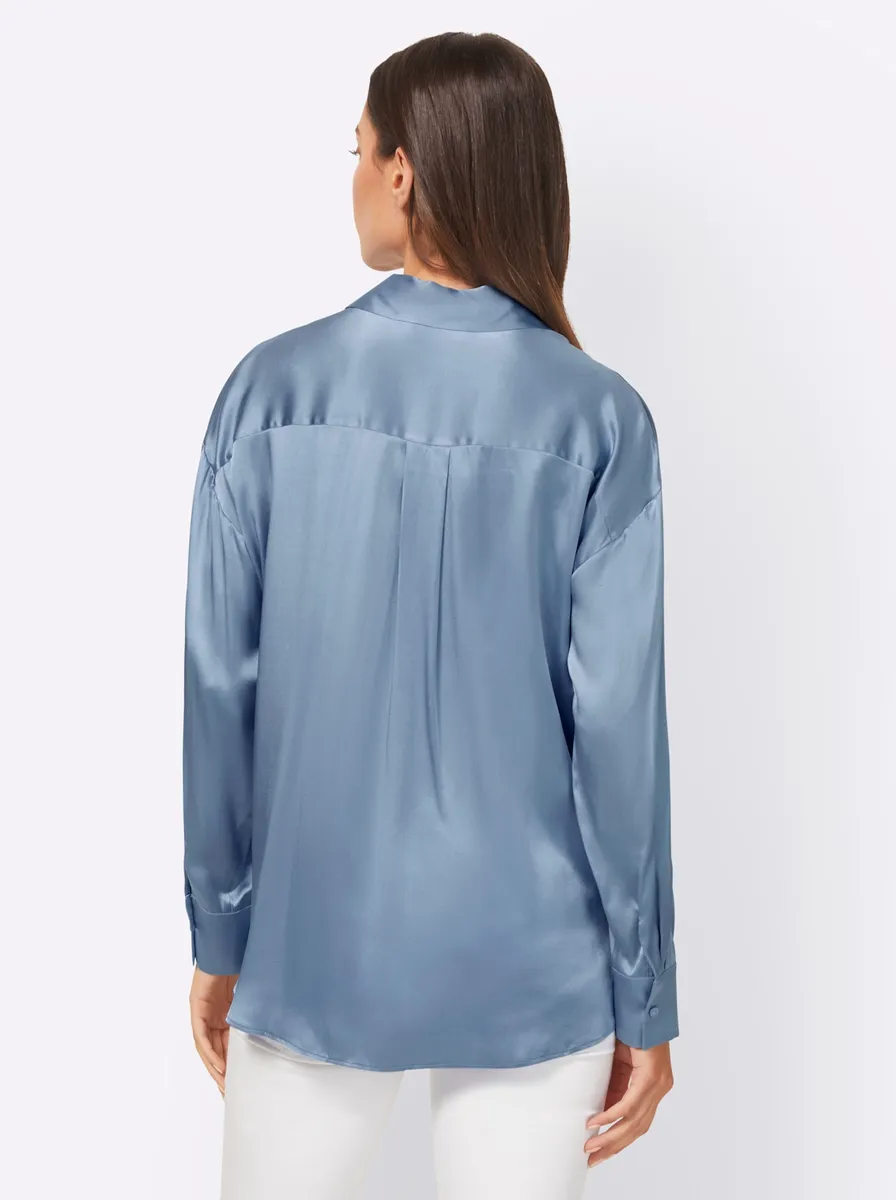 Блузка-рубашка из блестящего смесового шелка слегка объемного кроя. Длинные рукава с манжетами на пуговицах. 47% шелк, 44% вискоза, 9% эластан. Ручная стирка.