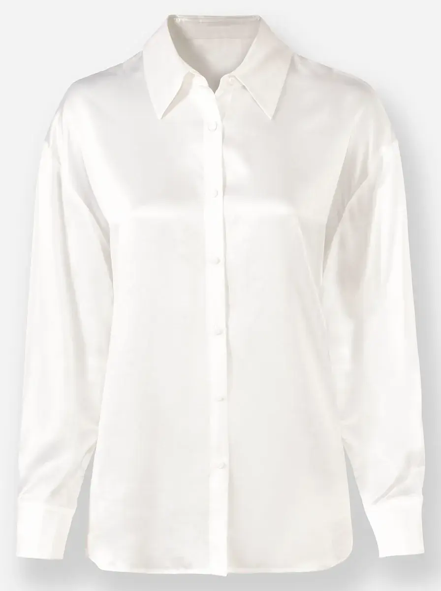Блузка-рубашка из блестящего смесового шелка слегка объемного кроя. Длинные рукава с манжетами на пуговицах. 47% шелк, 44% вискоза, 9% эластан. Ручная стирка.
