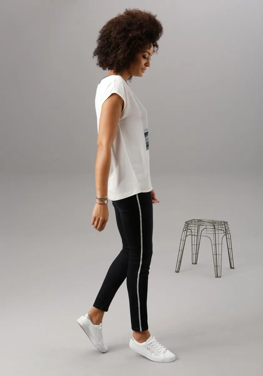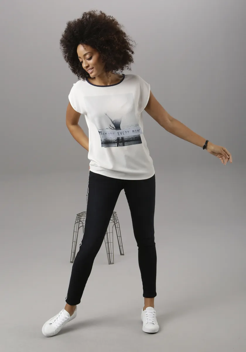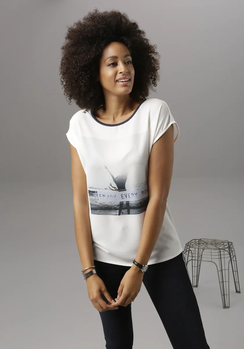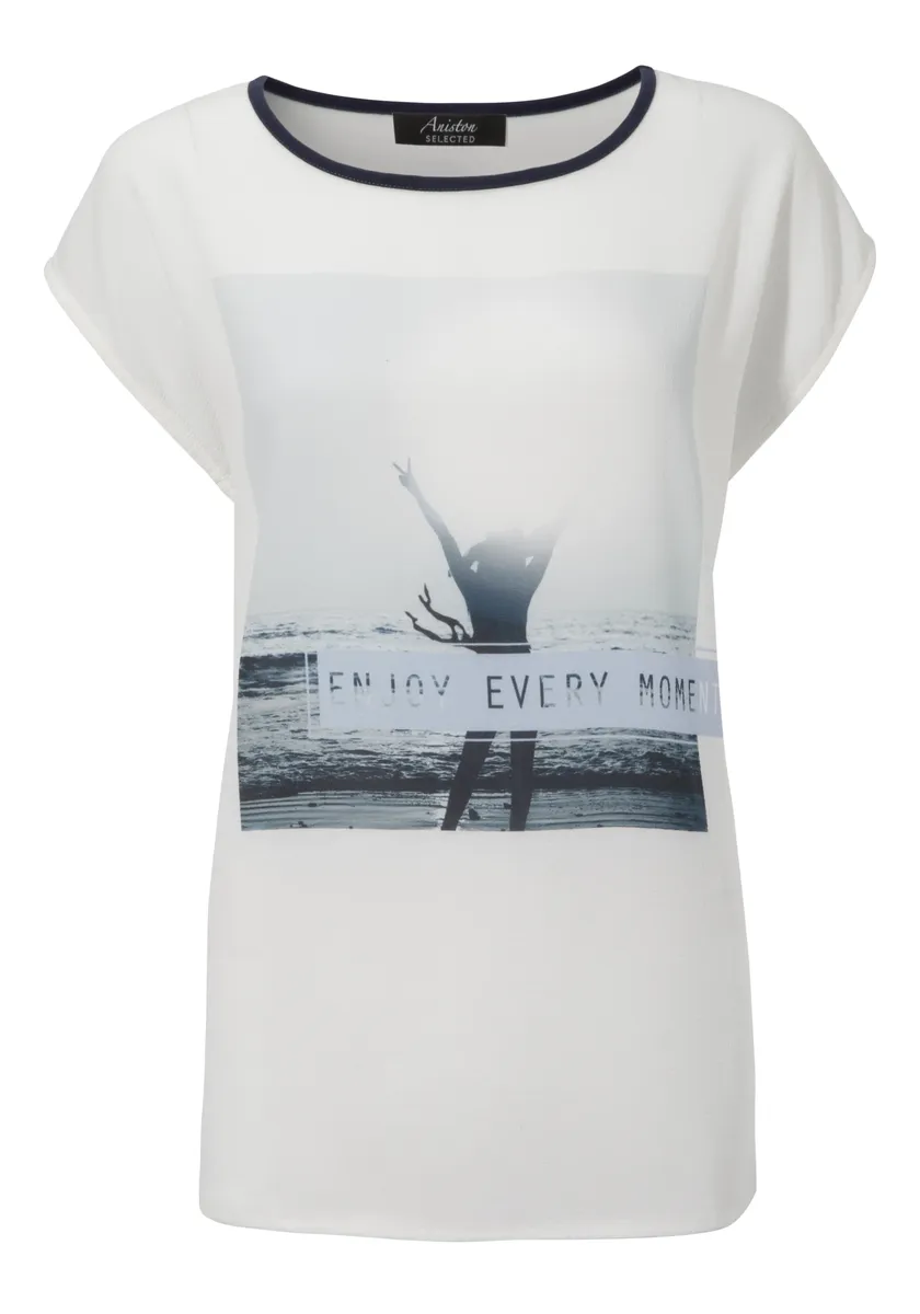 Блузка-рубашка от Aniston Selected. В сочетании материалов. Горловина круглая с обвязанным краем. Облегает фигуру. Изготовлен из комфортного сочетания материалов. Машинная стирка.