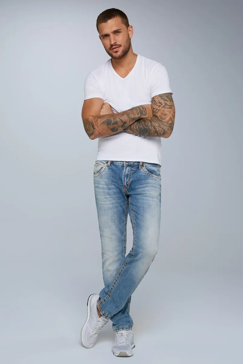 Легкая потертость, эффект морщин и оранжевая широкая строчка придают популярным джинсам CAMP DAVID стильный ретро-стиль. Обычный крой имеет нормальную высоту талии, застегивается на пуговицу и молнию, имеет прямой крой. Специальная упаковка для джинсов: Чтобы сохранить внешний вид джинсов, штанины джинсов специально собирают и доставляют упакованными таким образом. Рост модели 189 см, одежда W32/L34.