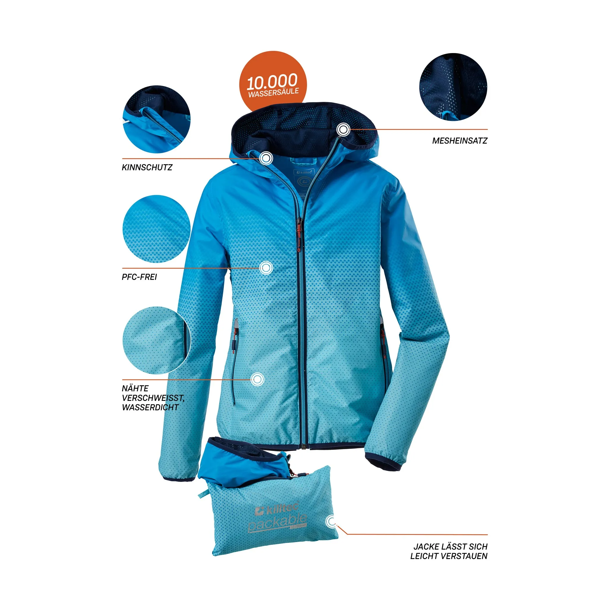 Легкая, компактная функциональная куртка для девочек от killtec — идеальный компаньон для любого активного отдыха. Куртку можно носить с собой куда угодно, она хранится в собственном кармане. Материал ветрозащитен и на 100% водонепроницаем благодаря сварным швам и водяному столбу 10 000 мм. Нежный узор с цветовым градиентом и контрастные молнии делают эту верхнюю куртку привлекательной для глаз. Для killtec особенно важно сделать коллекции более устойчивыми и ориентированными на будущее. killtec все больше полагается на более ответственные производственные процессы. Поэтому эта куртка была пропитана веществами, не содержащими фтора.
