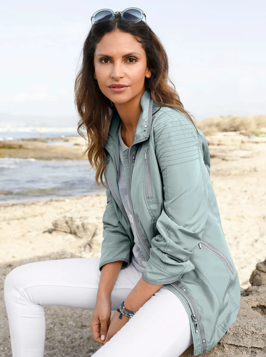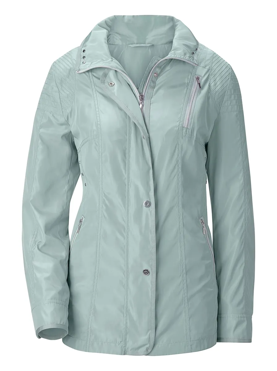 Легкая, мелко переливающаяся куртка для перехода со множеством деталей. Репсовая лента соответствующего цвета проходит вдоль регулируемого воротника, планки с кнопками, молнии и манжет с кнопками. Другие декоративные элементы включают серебристые заклепки и кнопки, а также контрастные швы. 3 передних кармана на молнии и 1 внутренний карман на пуговице. 100% полиэстер. Подкладка: 100% полиэстер. Машинная стирка.