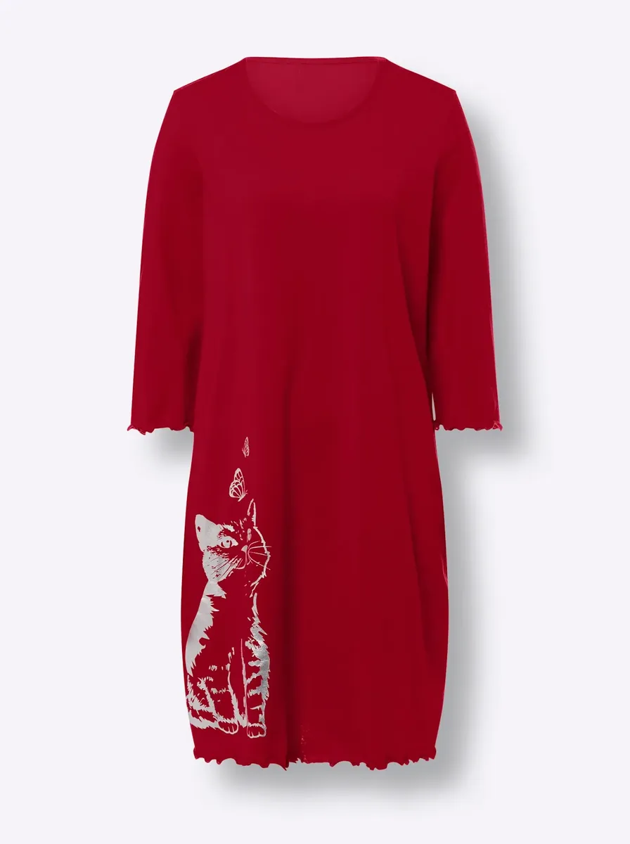 Внимание любителям кошек: перед вами действительно великолепная ночная рубашка! С большим серебристым мерцающим изображением кошки. Рукава 3/4 и подол украшены декоративной строчкой. Одинарный трикотаж. 100% хлопок.