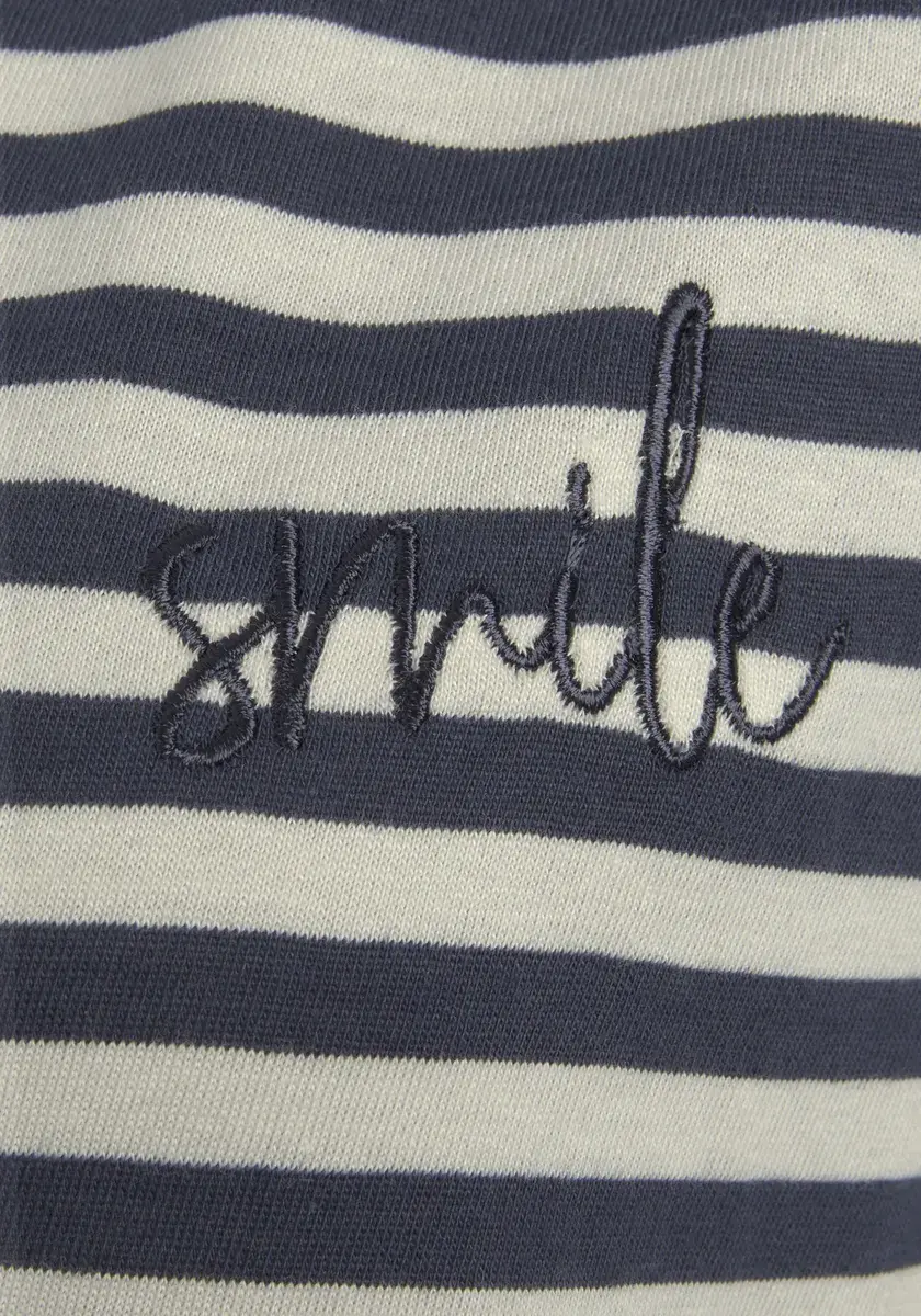 Большая рубашка от Vivance Dreams. С полосатым узором и тонкой вышивкой. Удобный крой с короткими рукавами реглан и круглым вырезом. Мягкий трикотаж высокого качества из хлопка.