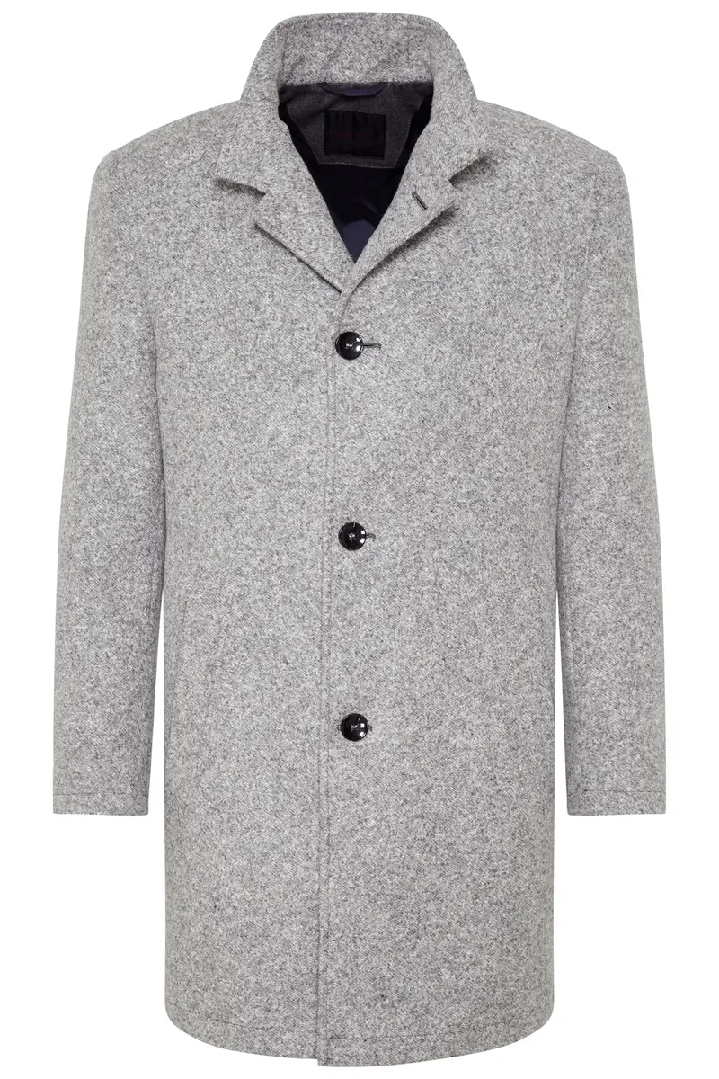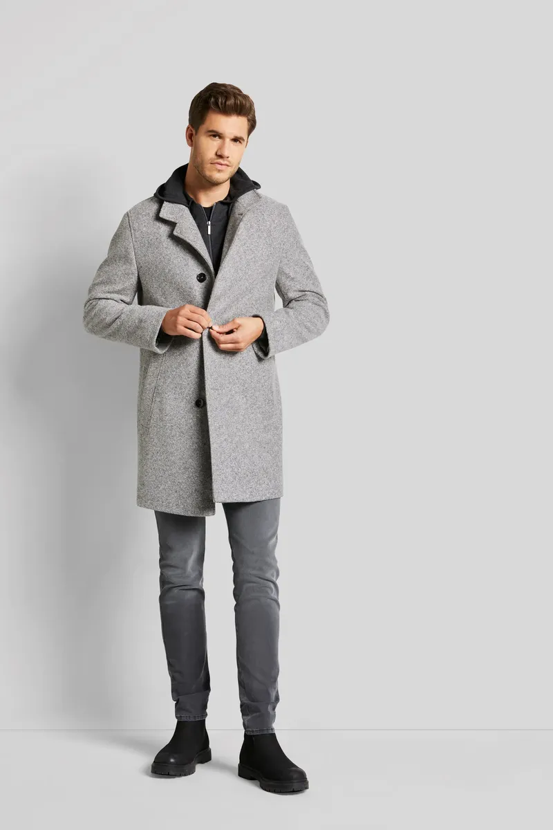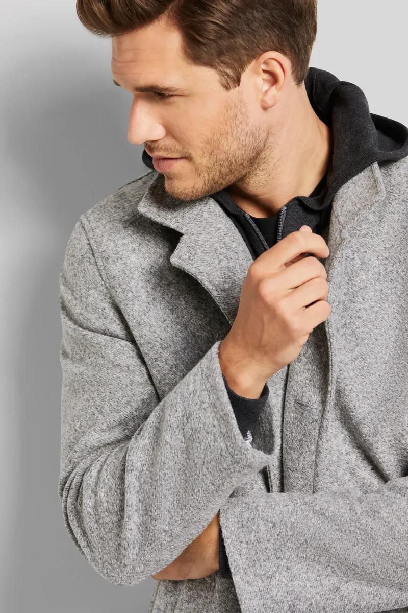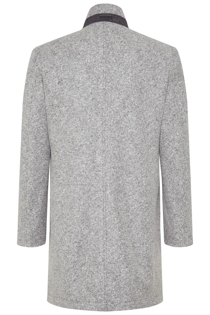 Классическое пальто с воротником стойкой и косыми прорезными карманами. Лента под воротником выполнена из фланелевой ткани и создает красивый акцент, как только воротник сложен. Трикотажное изделие с функцией растяжения впечатляет пестрым узором и легкой структурой.