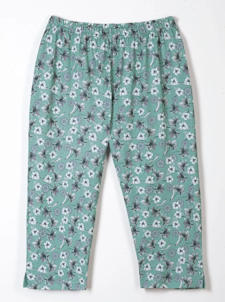 Воздушная пижама-капри с цветочным принтом спереди. Круглый вырез горловины декорирован кантом. Капри с удобным эластичным поясом по всему периметру и стильными разрезами по бокам. Изготовлен из тонкого одинарного трикотажа. 100% хлопок.