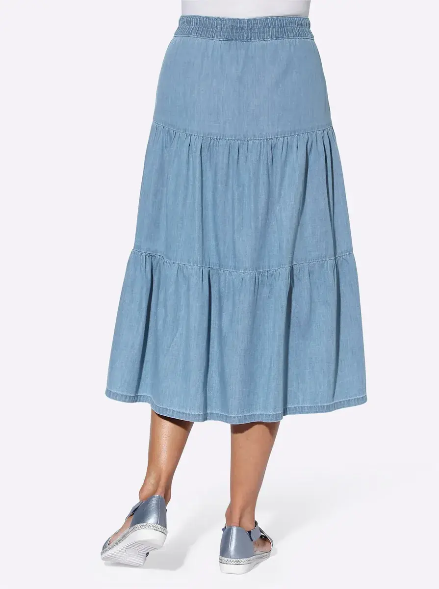 Воздушная, легкая джинсовая юбка модного фасона с тремя ярусами слегка оборок. Удобная форма без шнуровки с эластичным поясом по всему периметру. Сделано из чистого хлопка – поддерживает инициативу «Хлопок, сделанный в Африке». 100% хлопок. Машинная стирка.
