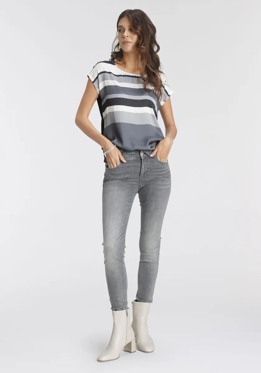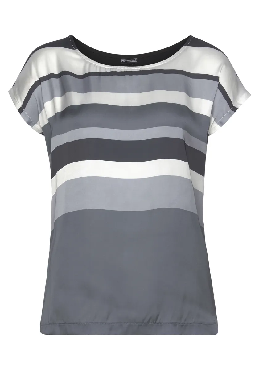 Легко сочетаемая женская блузка-рубашка от Laura Scott в полосатом виде. Прикрывающий бедра и облегающий фигуру крой. Рукава короткие. Мягко ниспадающий топ благодаря эластичному и эластичному одинарному трикотажу.
