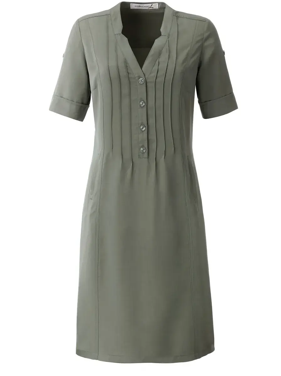 Легкое платье, мягкое, струящееся. С V-образным вырезом и двумя вертикальными прорезными карманами. Планка на пуговицах декорирована защипами. Задний ремень на уровне талии для индивидуальной регулировки ширины. Рукава закатываются, фиксируются пуговицей и хлястиком. 100% лиоцелл (ТЕНСЕЛЬ). Машинная стирка. С поясом-завязкой.