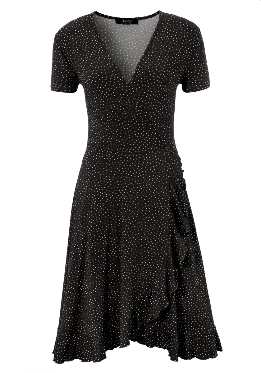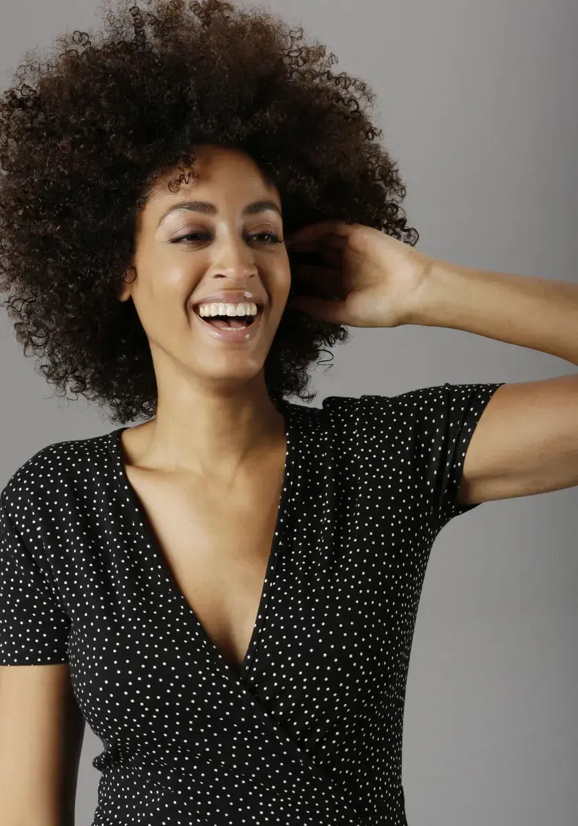 Летнее платье Aniston SELECTED из эластичной смесовой вискозы. В женственном образе накидка и волан. В современном точечном дизайне. Машинная стирка.