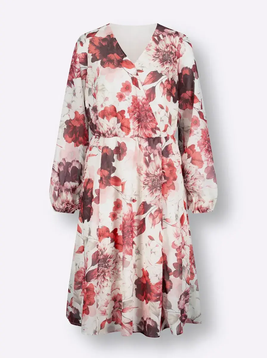 Волшебный цветочный дизайн и ароматное качество жоржета: в платье с принтом просто влюбляешься. Перекрывающийся V-образный вырез со потайной кнопкой. Расклешенный А-образный силуэт подчеркивает фигуру, моделирующие вытачки на груди и оборки на талии. Актуальные длинные рукава-фонарики с эластичными манжетами. 100% полиэстер. Подкладка: 100% полиэстер. Машинная стирка.