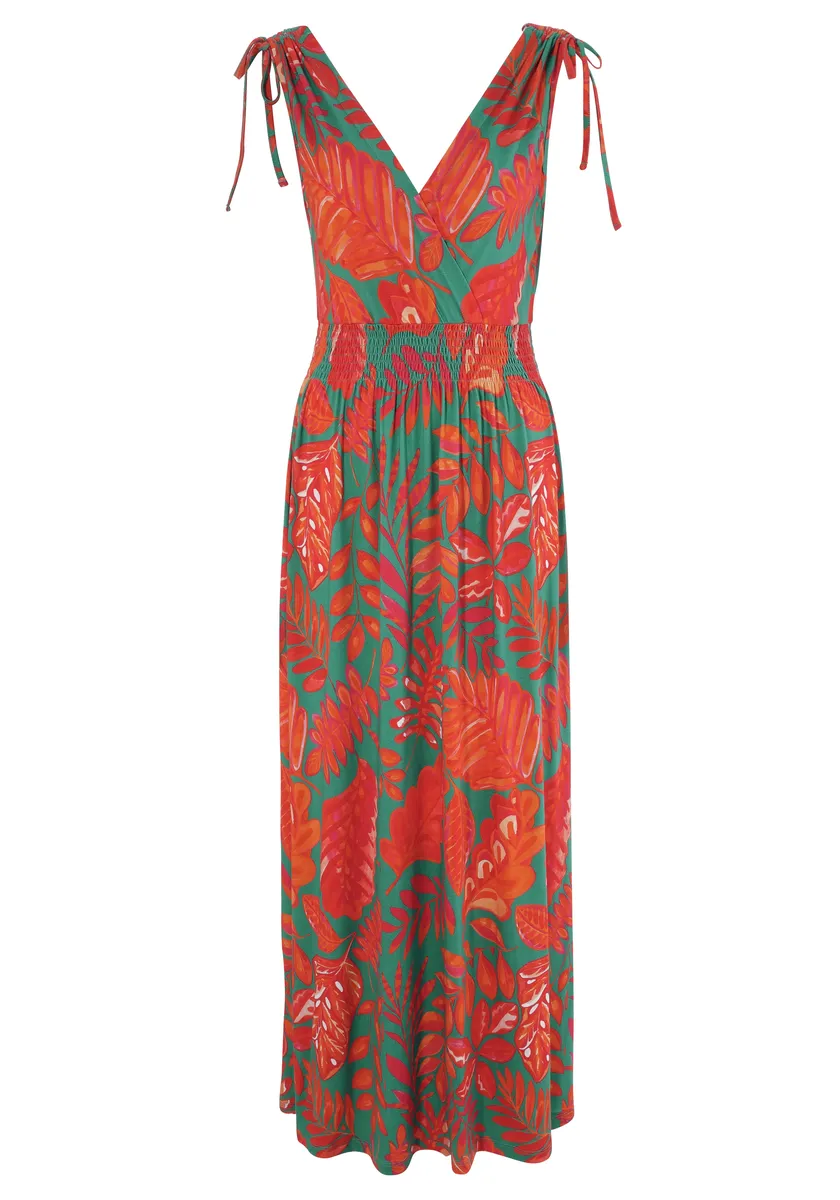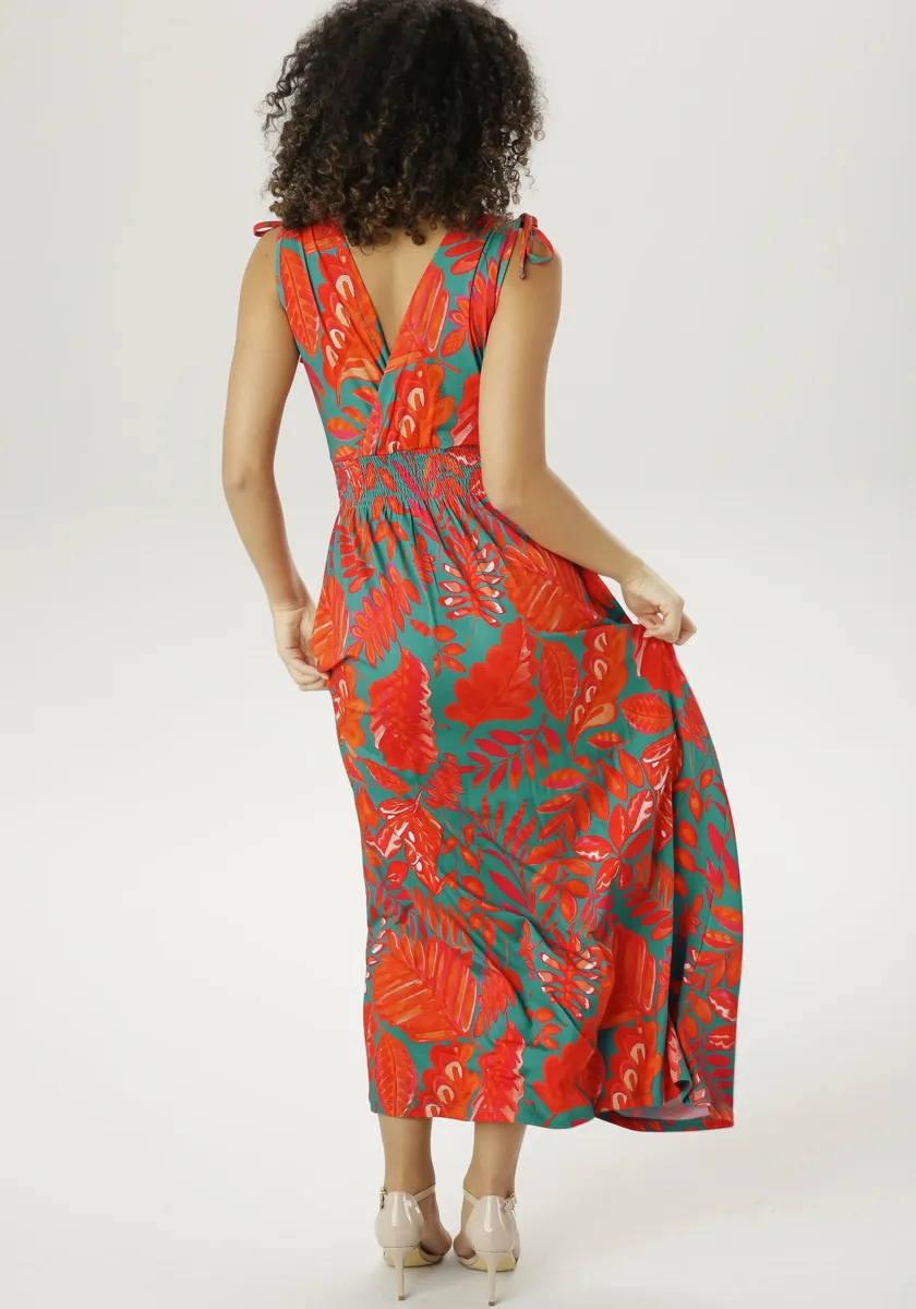 Летнее платье от Aniston Selected с принтом в виде листьев ярких цветов. Изготовлен из вискозы и эластана - одинарный трикотаж. Широкие бретели с кулиской и завязкой для сбора. Перед и спина с V-образным вырезом с запахом. Присборенная вставка на талии. Также идеально подходит для пляжа. Облегающий фигуру крой. Платье макси - длина в 36 размере около 132см. Машинная стирка.