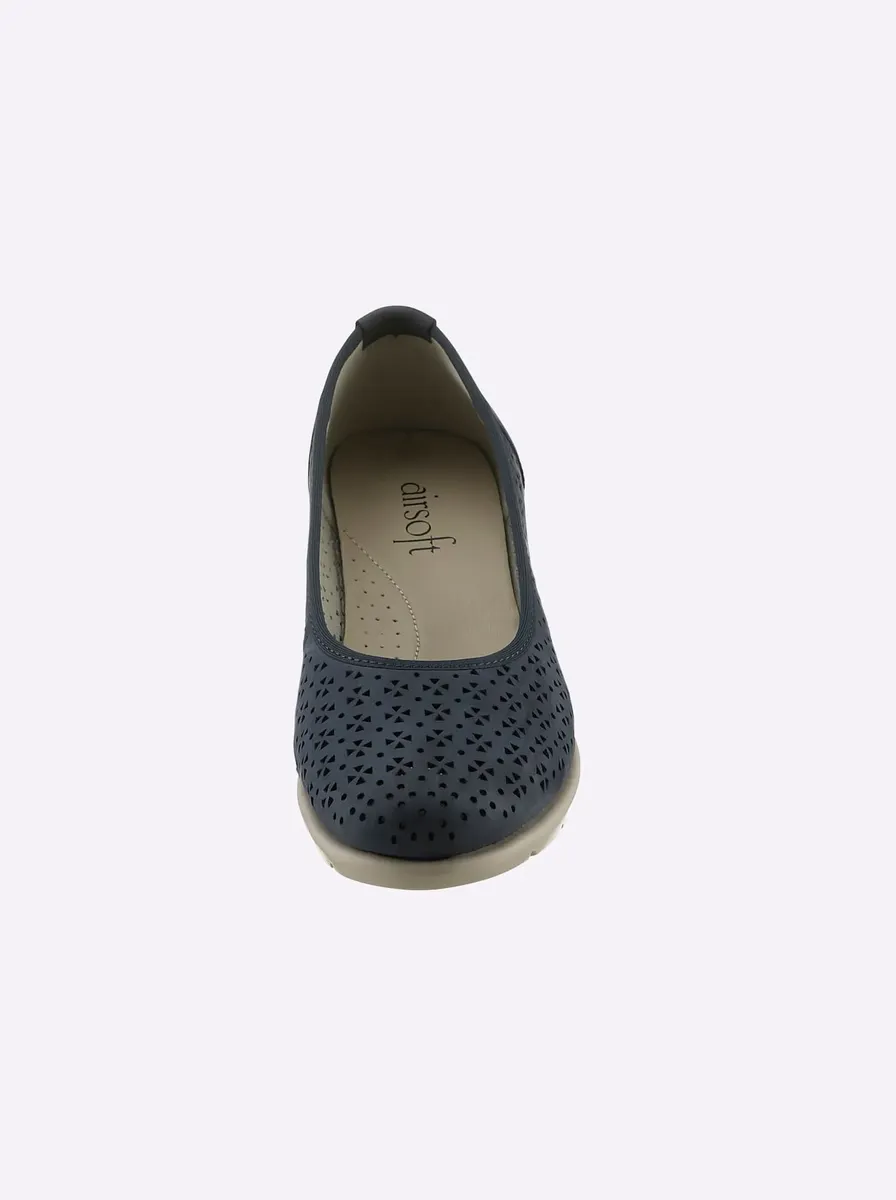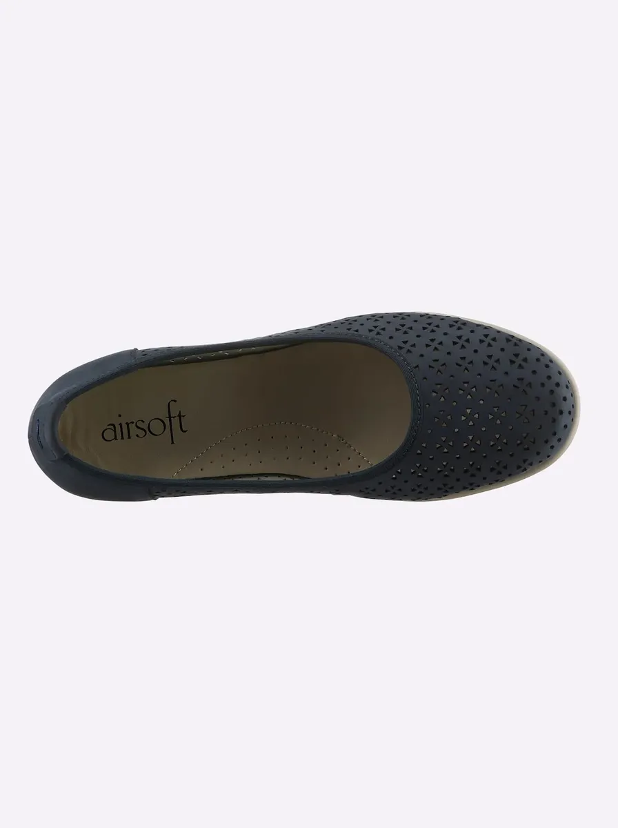 Летние легкие балетки Airsoft Comfort+. Верхний материал из бархатистой мягкой замши с рисунком отверстий. Салон из искусственной кожи. Резиновая подошва с удобной танкеткой высотой около 35 мм. Ширина Г.